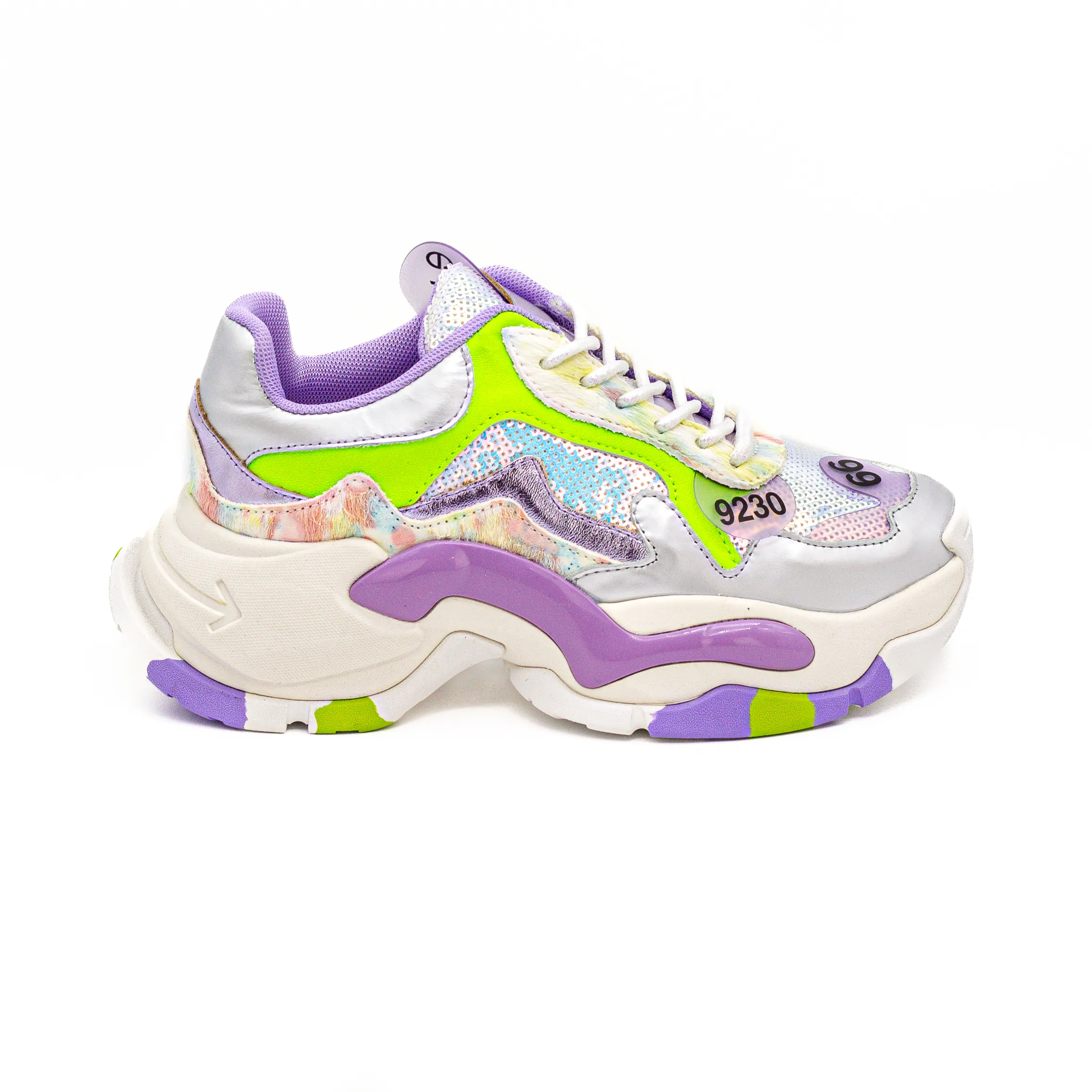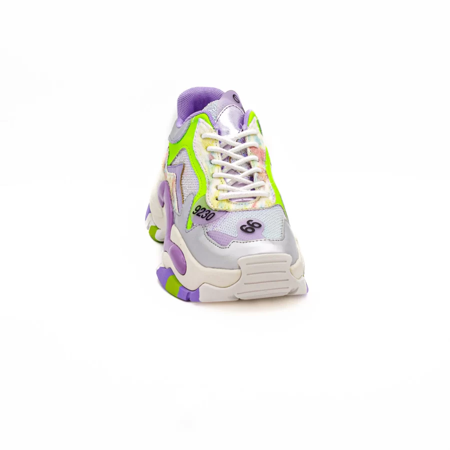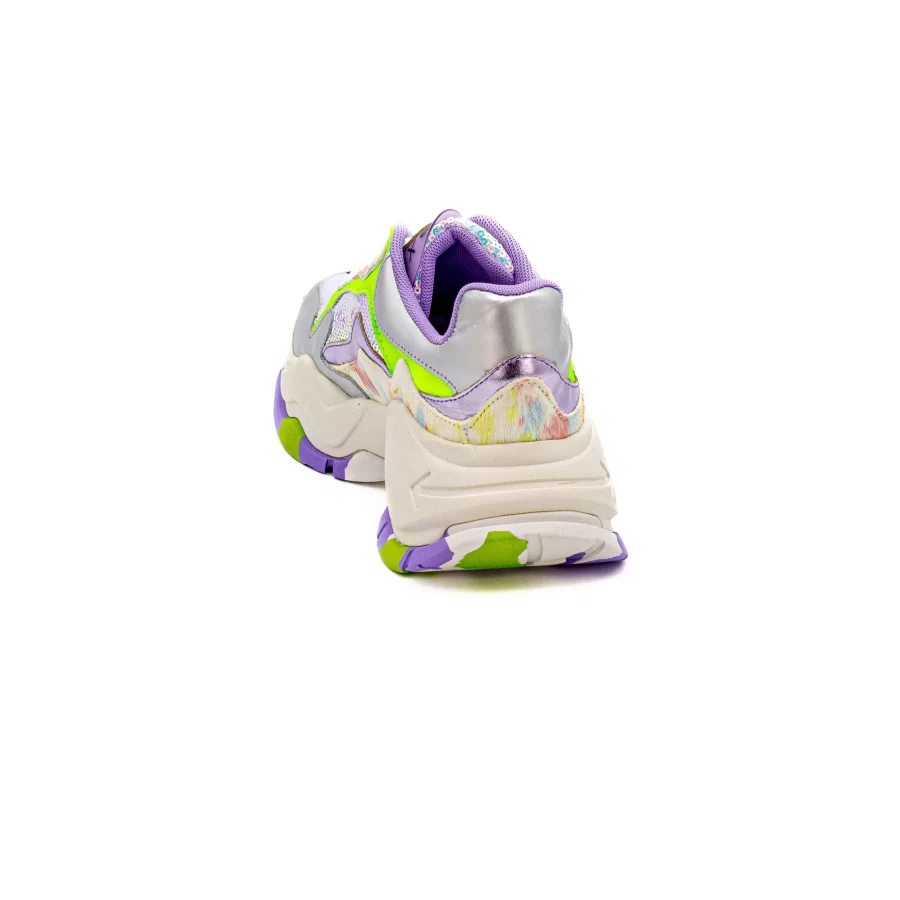 Esta sapatilha com contraste de texturas e detalhes de diversas cores que complementam os looks mais discreto.