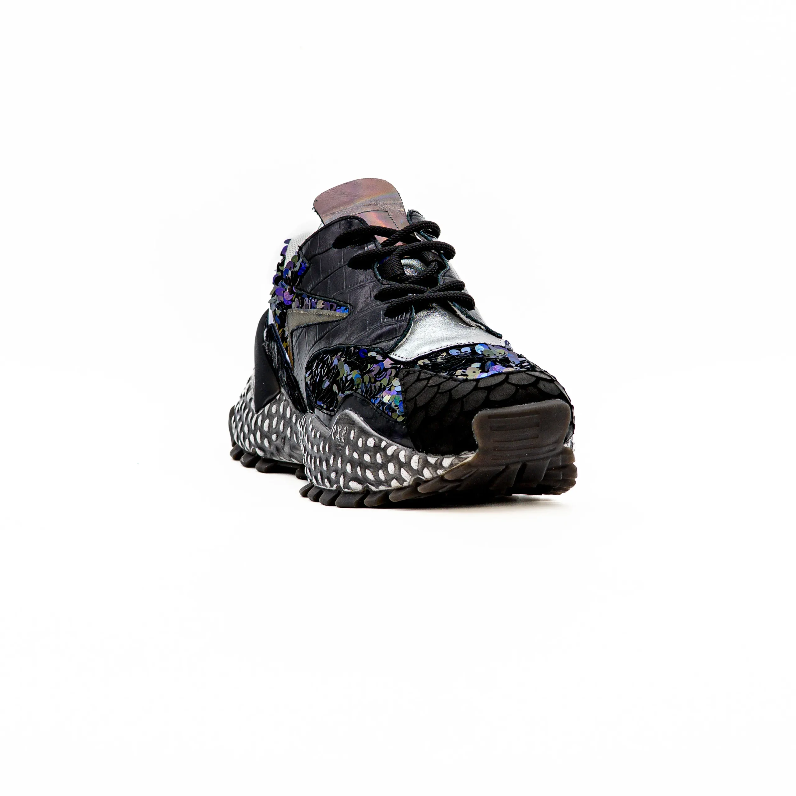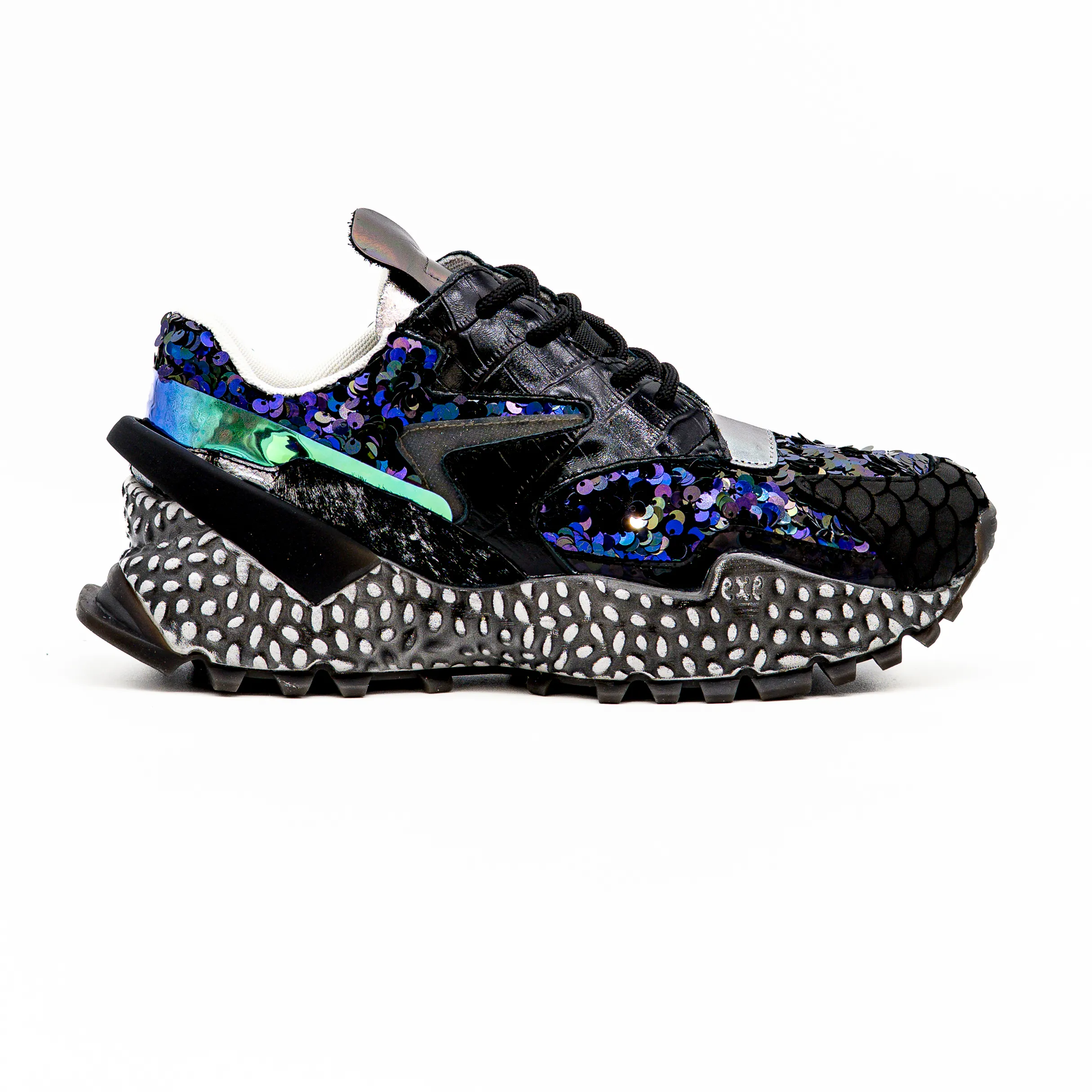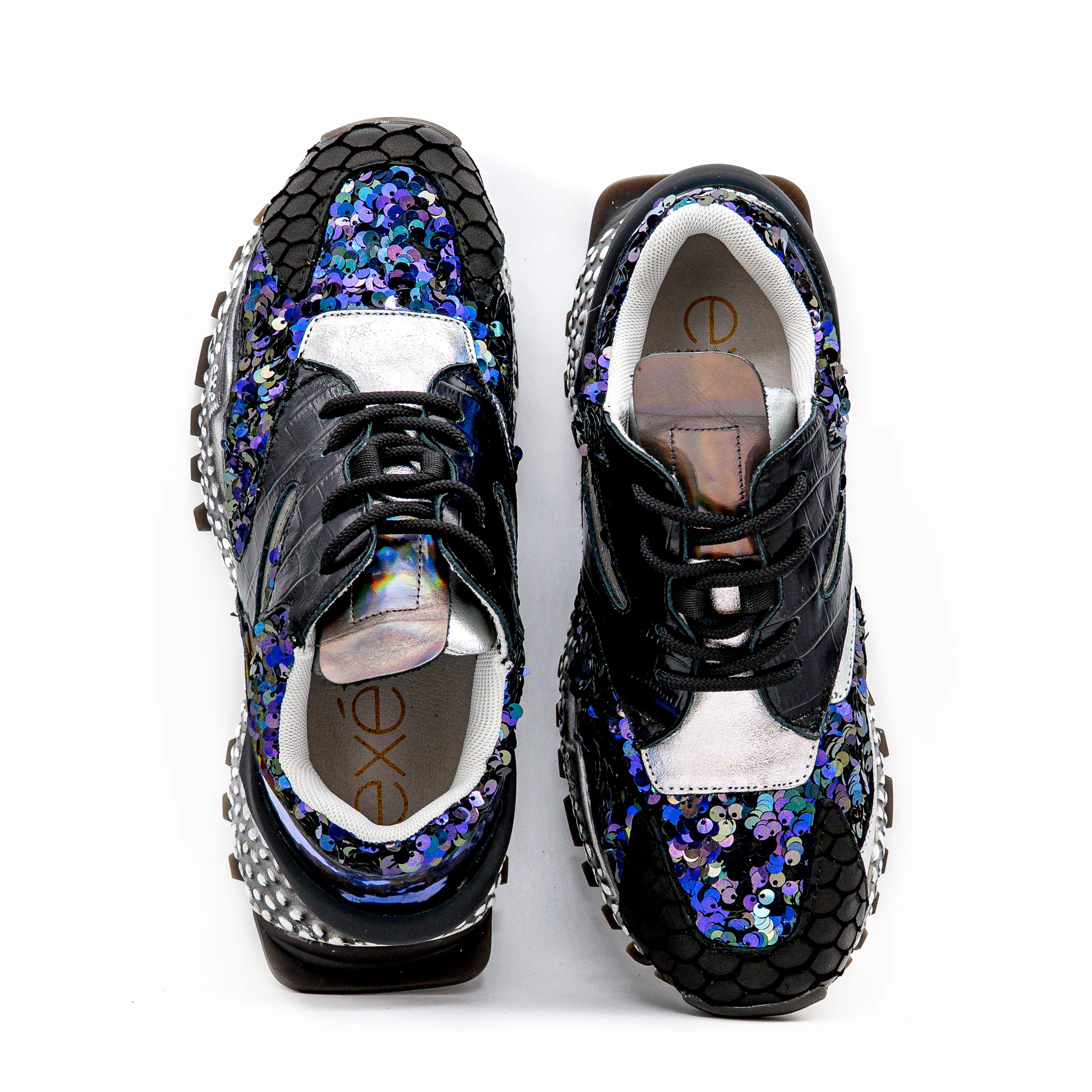 Este par da Exé é composto por uma pelicula holográfica na zona do calcanhar e lantejolas que dão visibilidade e estilo ao modelo.