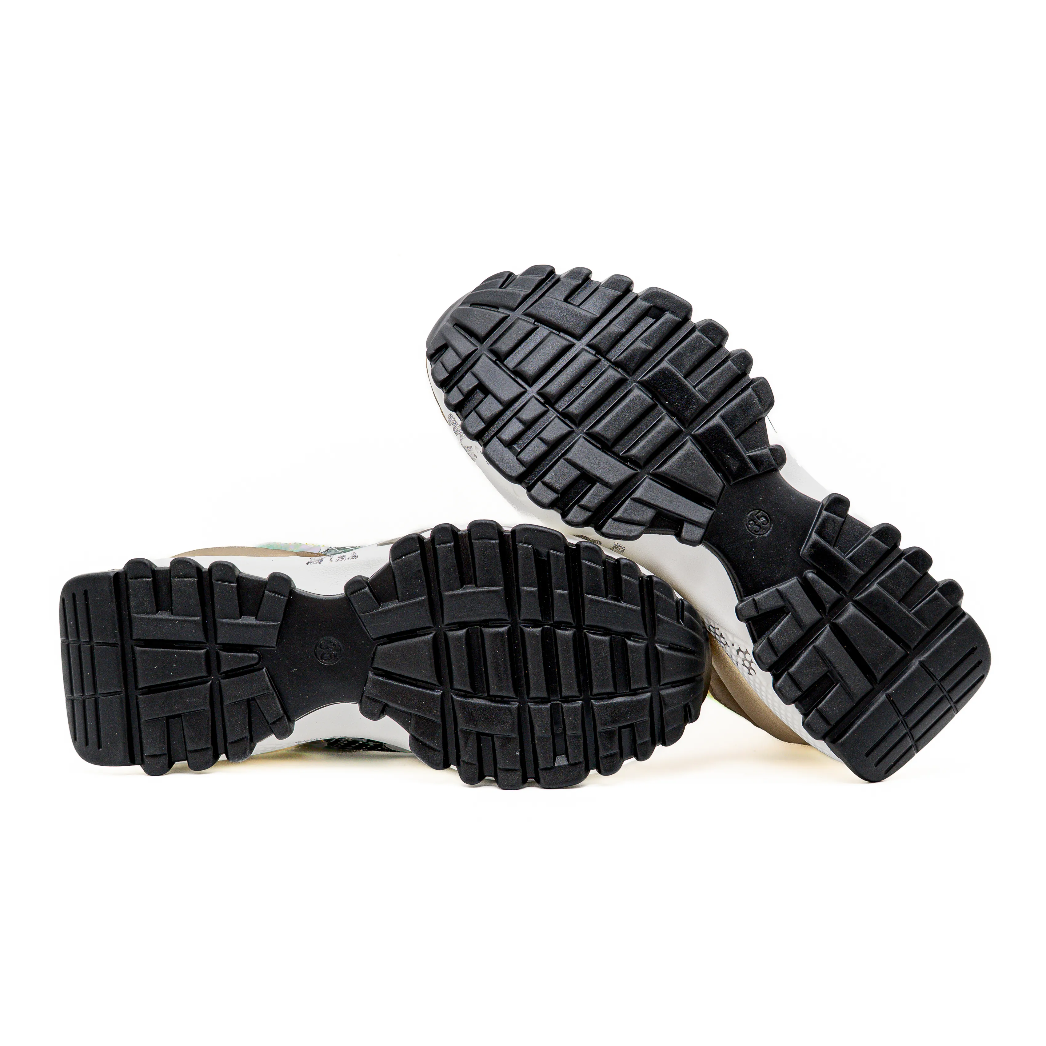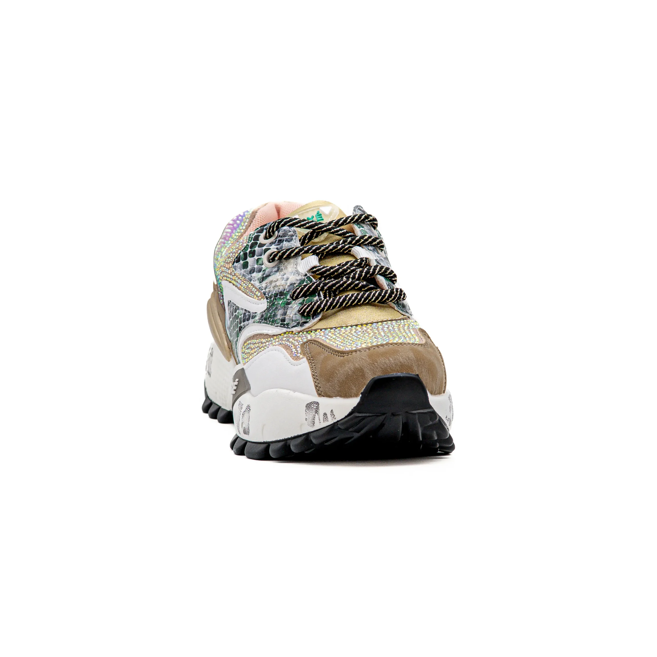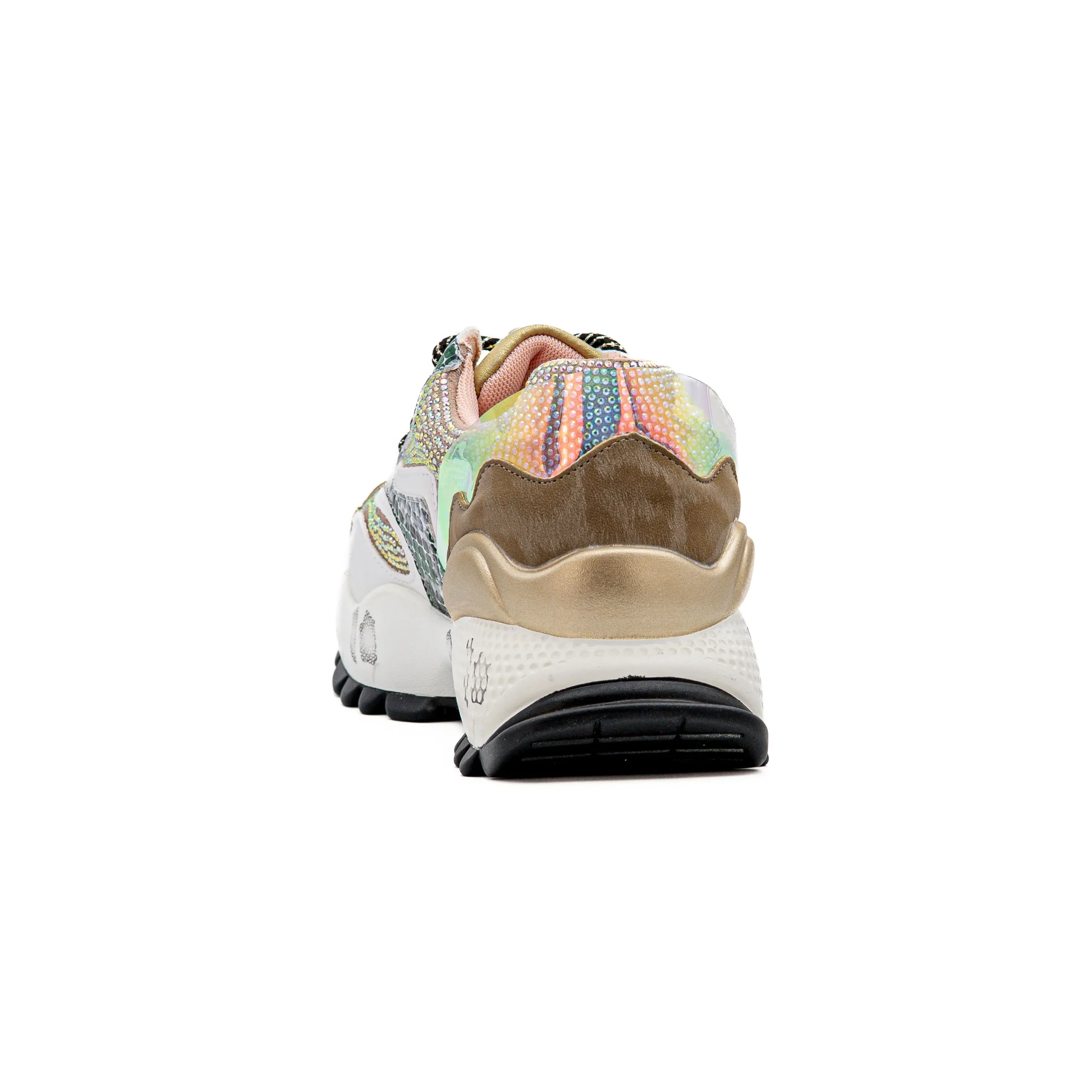 Estas sapatilhas conquistam pelo mix de cores e texturas, onde os tons naturais se cruzam com apontamentos e brilhos subtis, criando um visual moderno e cheio de personalidade.