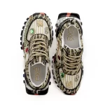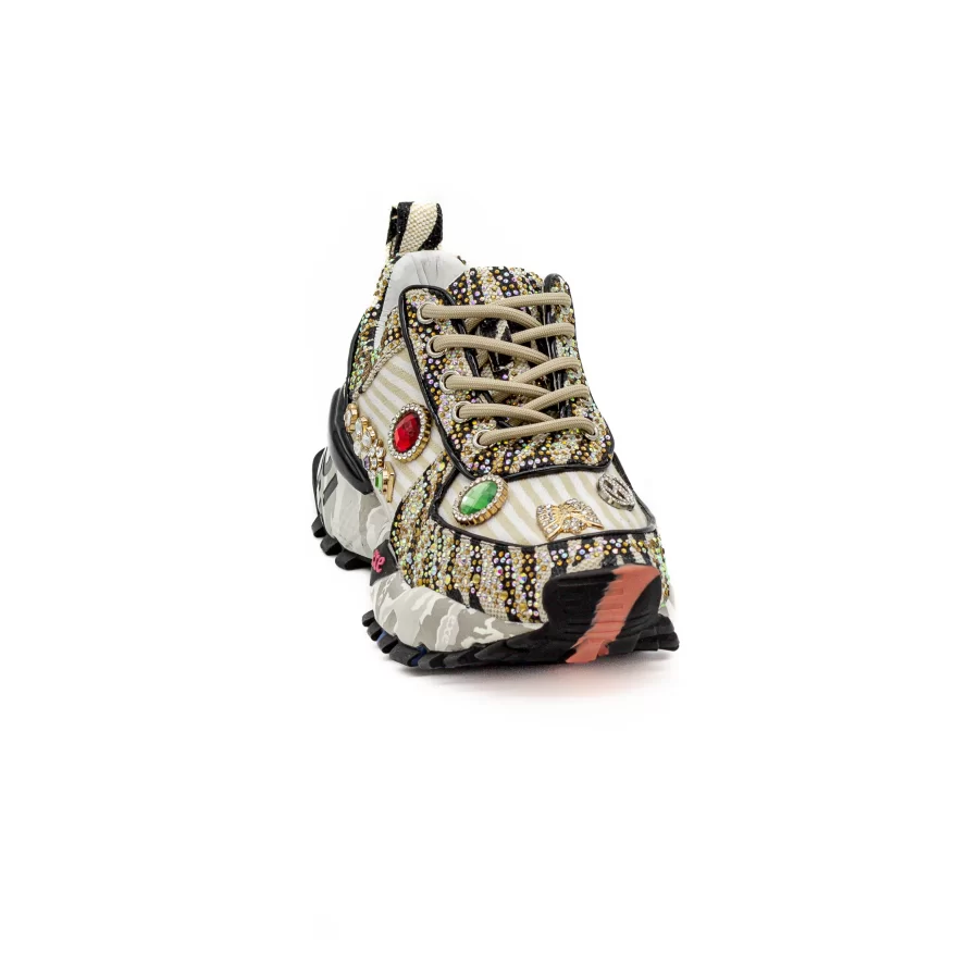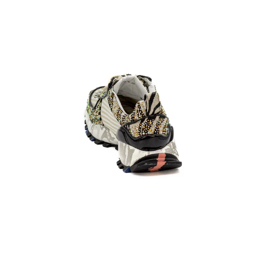 Sapatilha de mulher SY24-6, da Exé, em tecido, com detalhes e aplicações em cores de contraste, com uma sola levemente inclinada e atacadores, nos tons base do modelo.