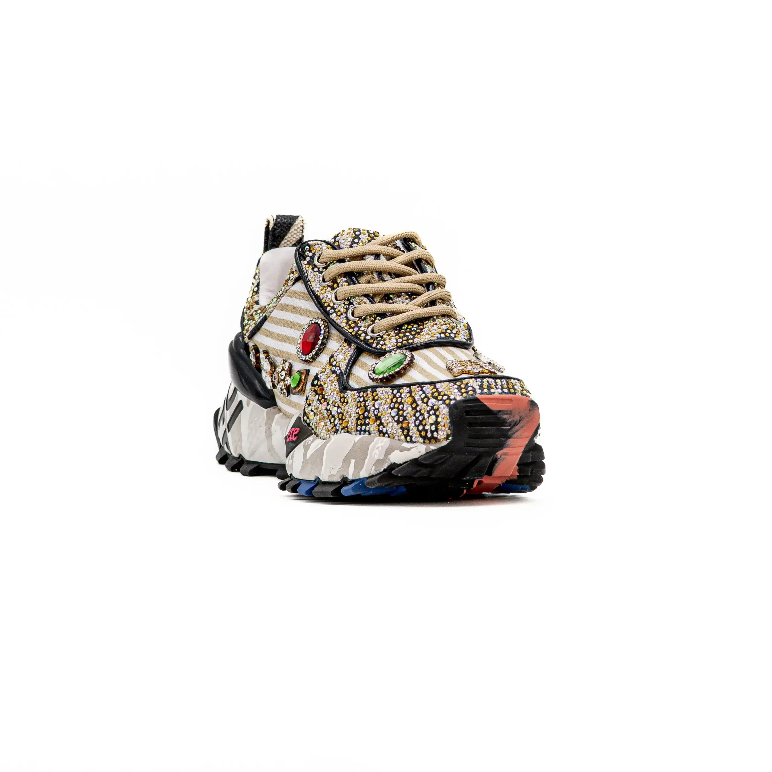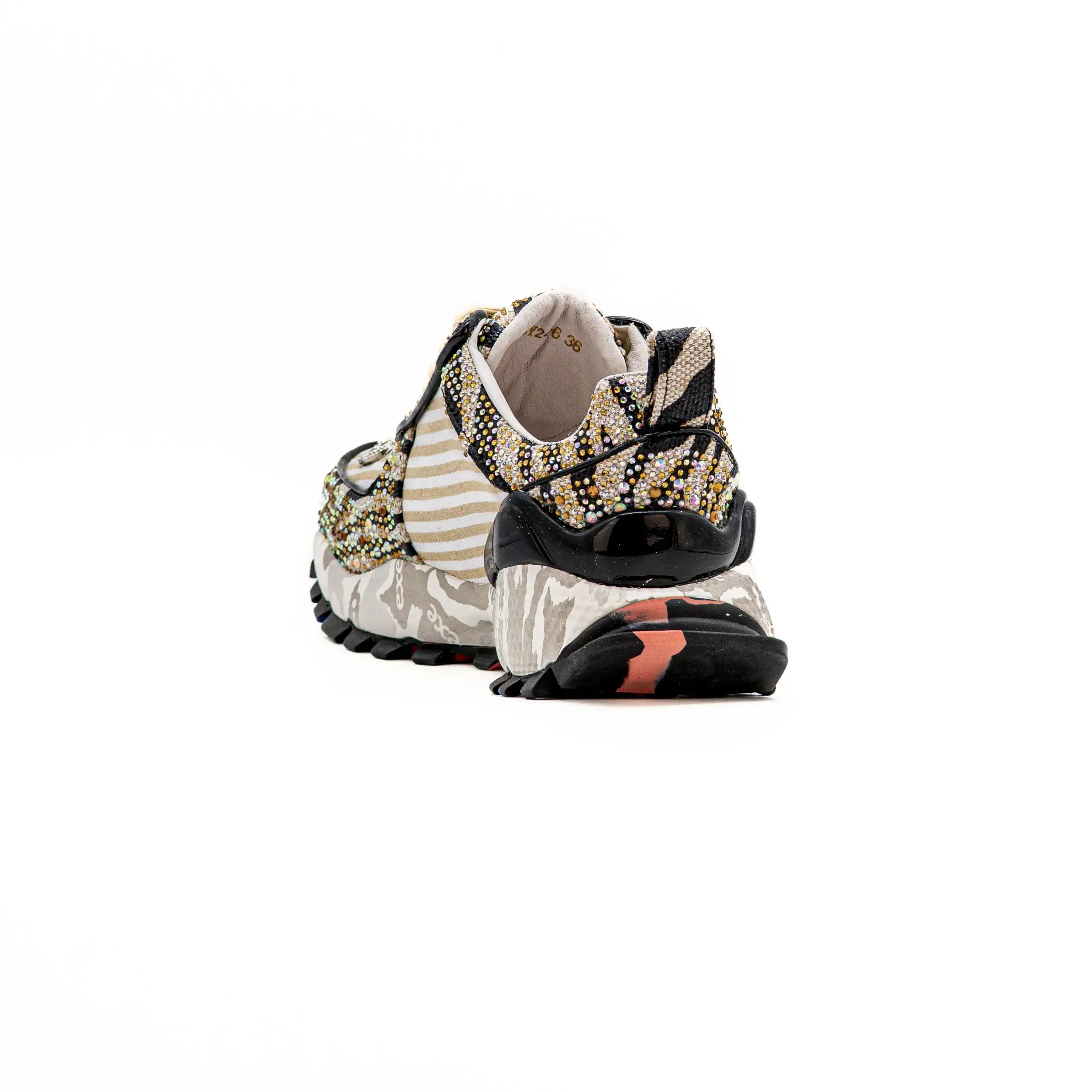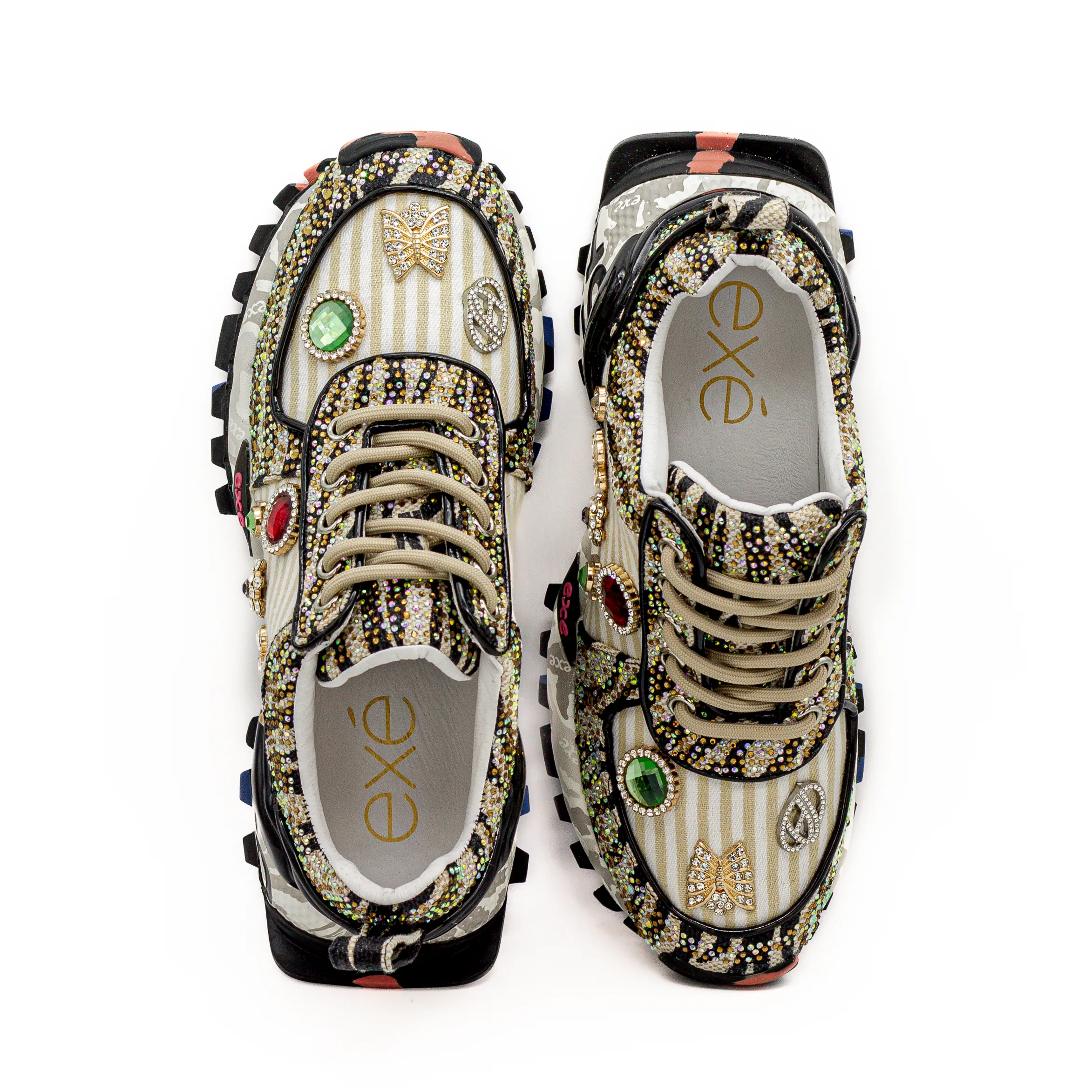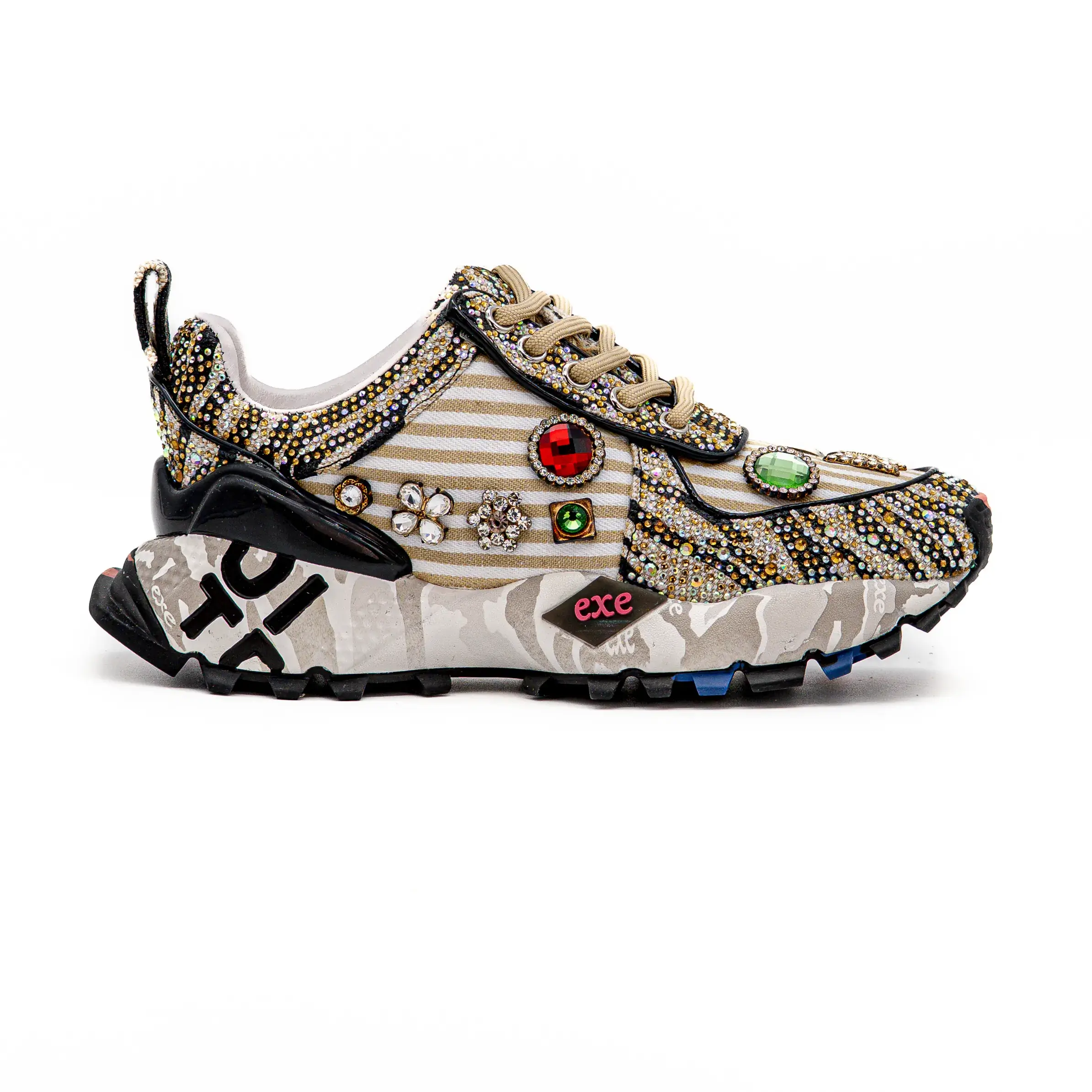 - Aplicações em brilho, douradas e coloridas, na biqueira e laterais;