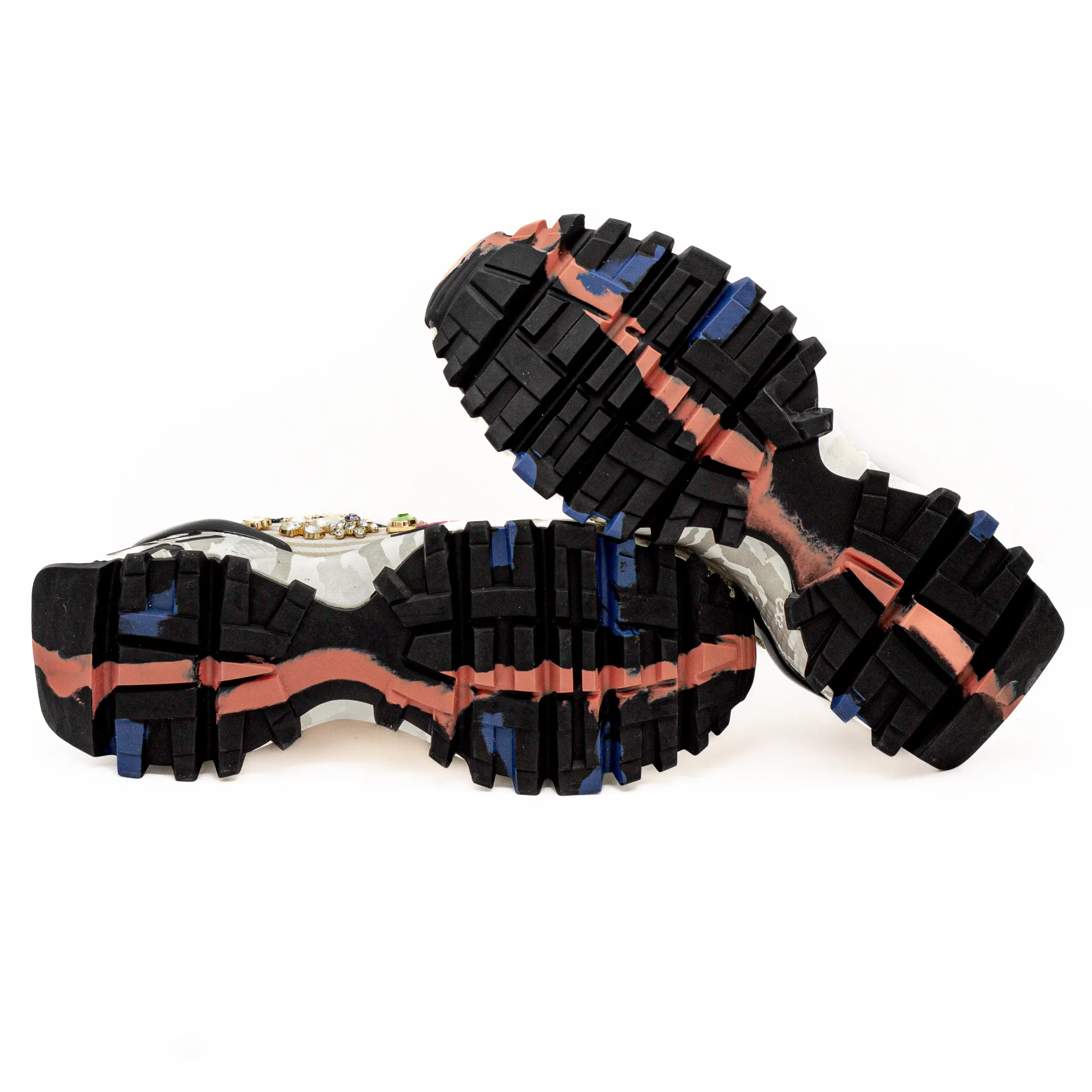 - Sola com cerca de 4 cm, de base branca com uma leve mistura em cinza, e detalhes em preto;