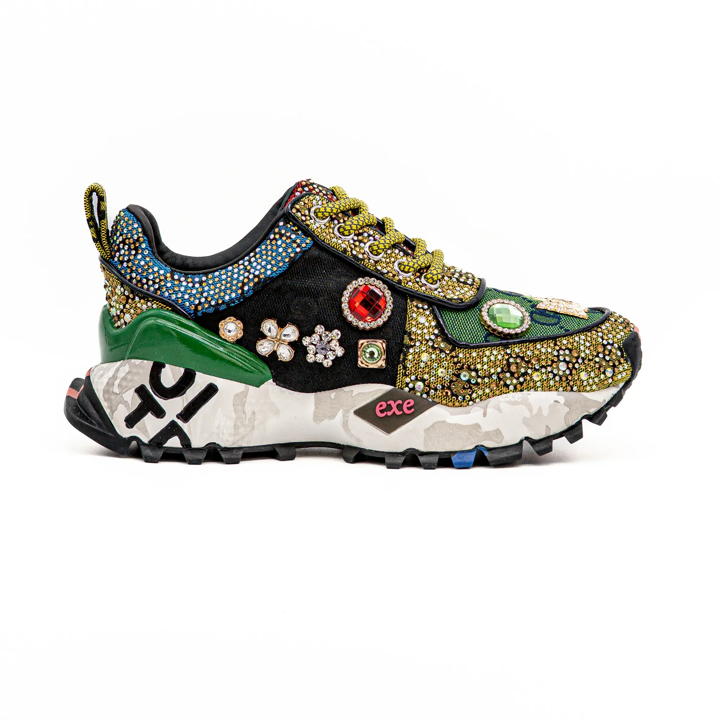 Sapatilha para mulher em tecido de base escura, com detalhes decorativos, por todo o modelo, numa combinação harmoniosa, que resulta numa completa versatilidade.