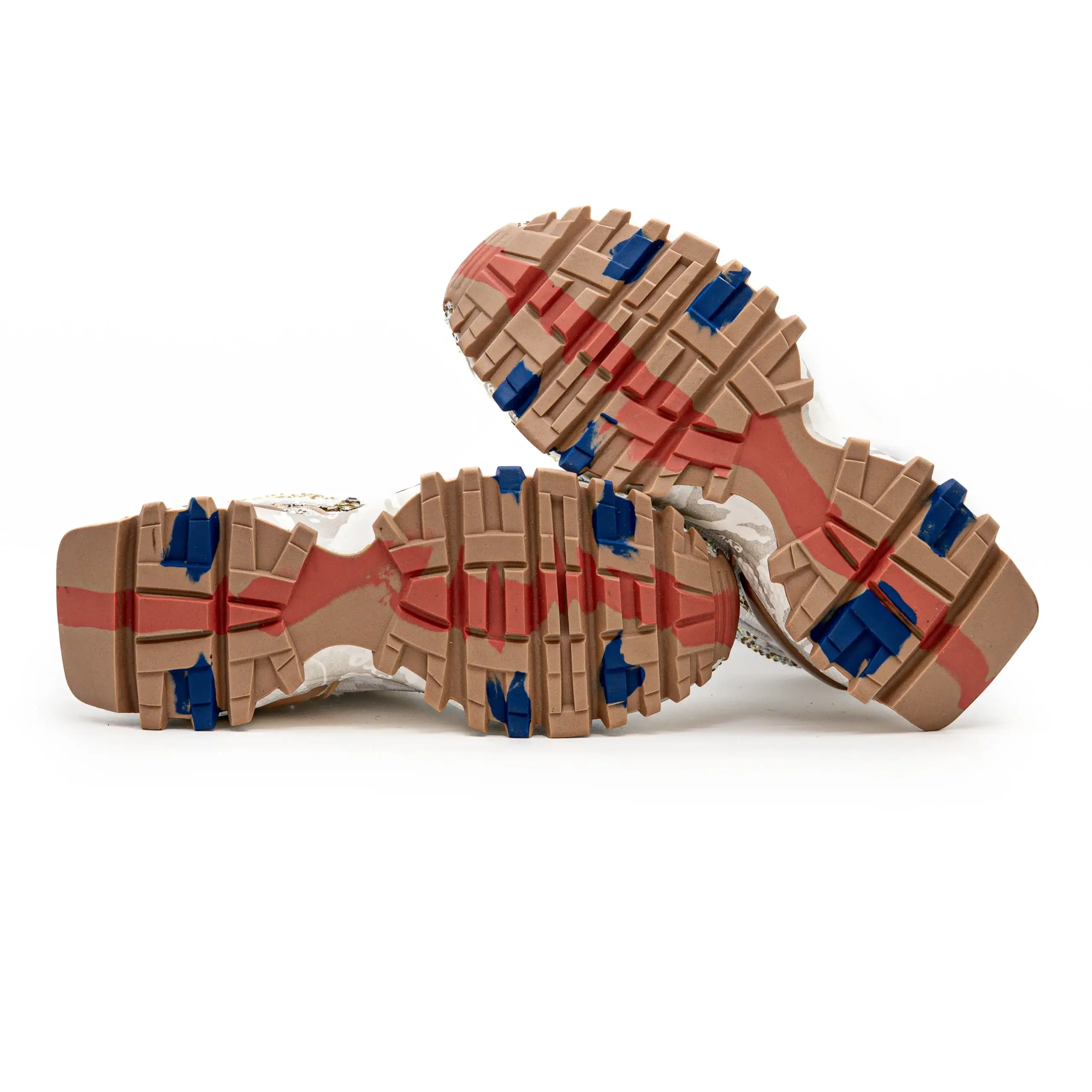Sapatilha de mulher, da Exé, com contraste de cores, padrões e texturas, com detalhes e aplicações salientes.