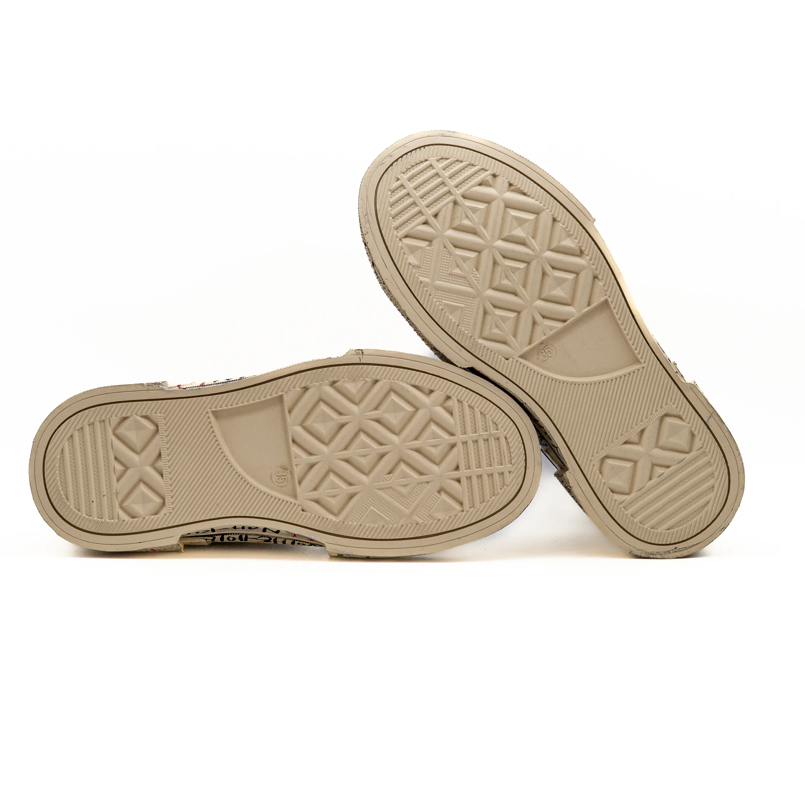 A sola desta sapatilha de mulher tem uma inclinação pouco acentuada, que garante o apoio perfeito no pé ao caminhar e a sua base é em borracha criando um contacto mais seguro com o solo.