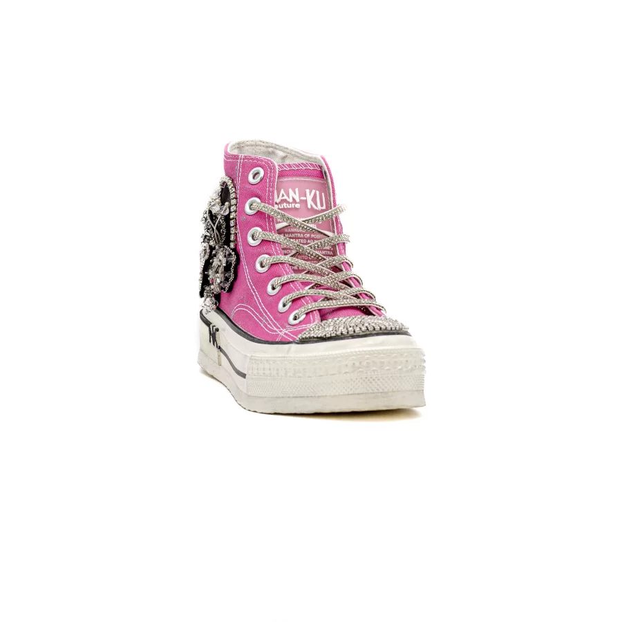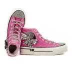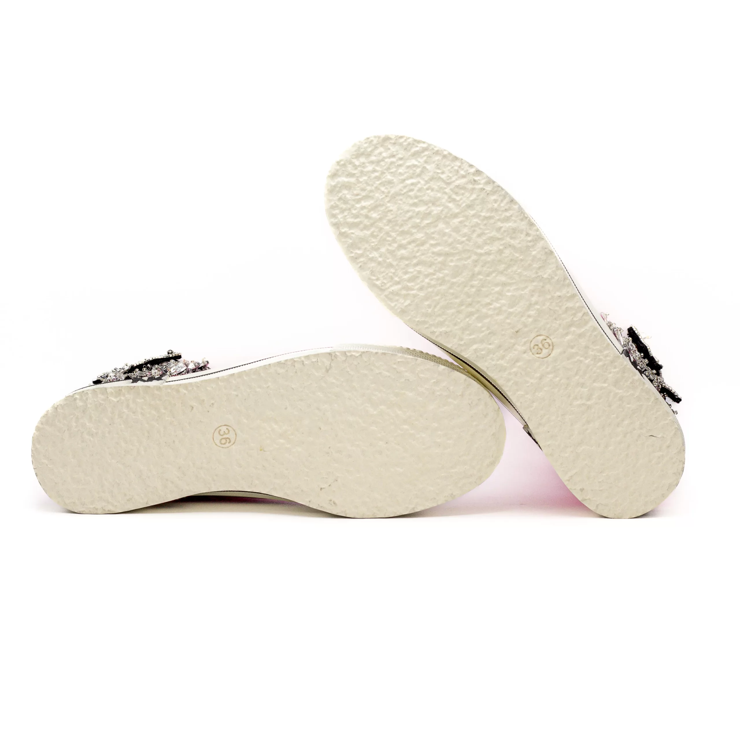 Esta sapatilha de mulher, tem o exterior em tecido, complementada com diversas aplicações e brilhos, na lateral que lhe conferem máxima elegância.