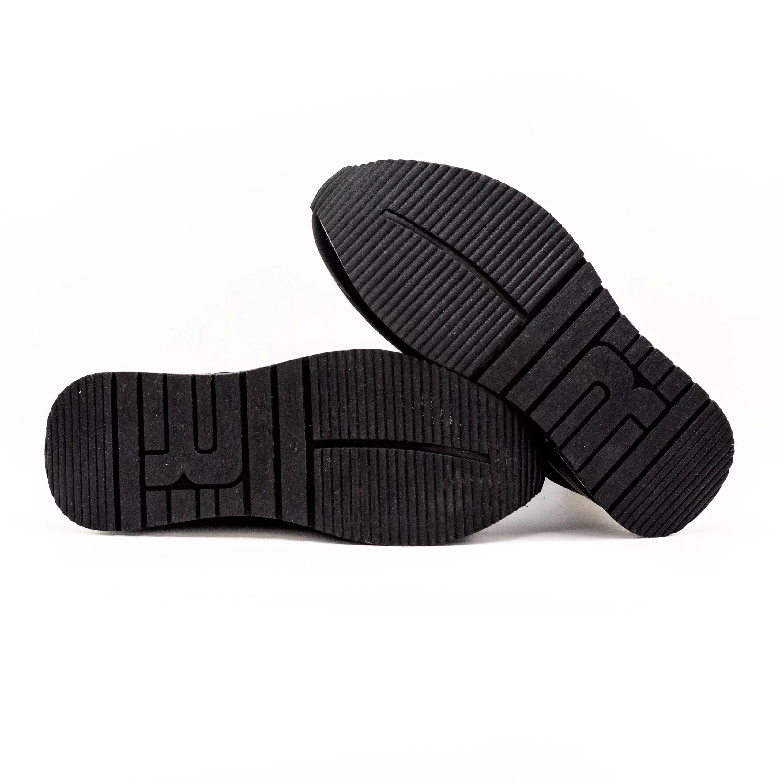 O reforço da sola, em borracha, que se prolonga até à biqueira, cria um contacto mais seguro com o solo.