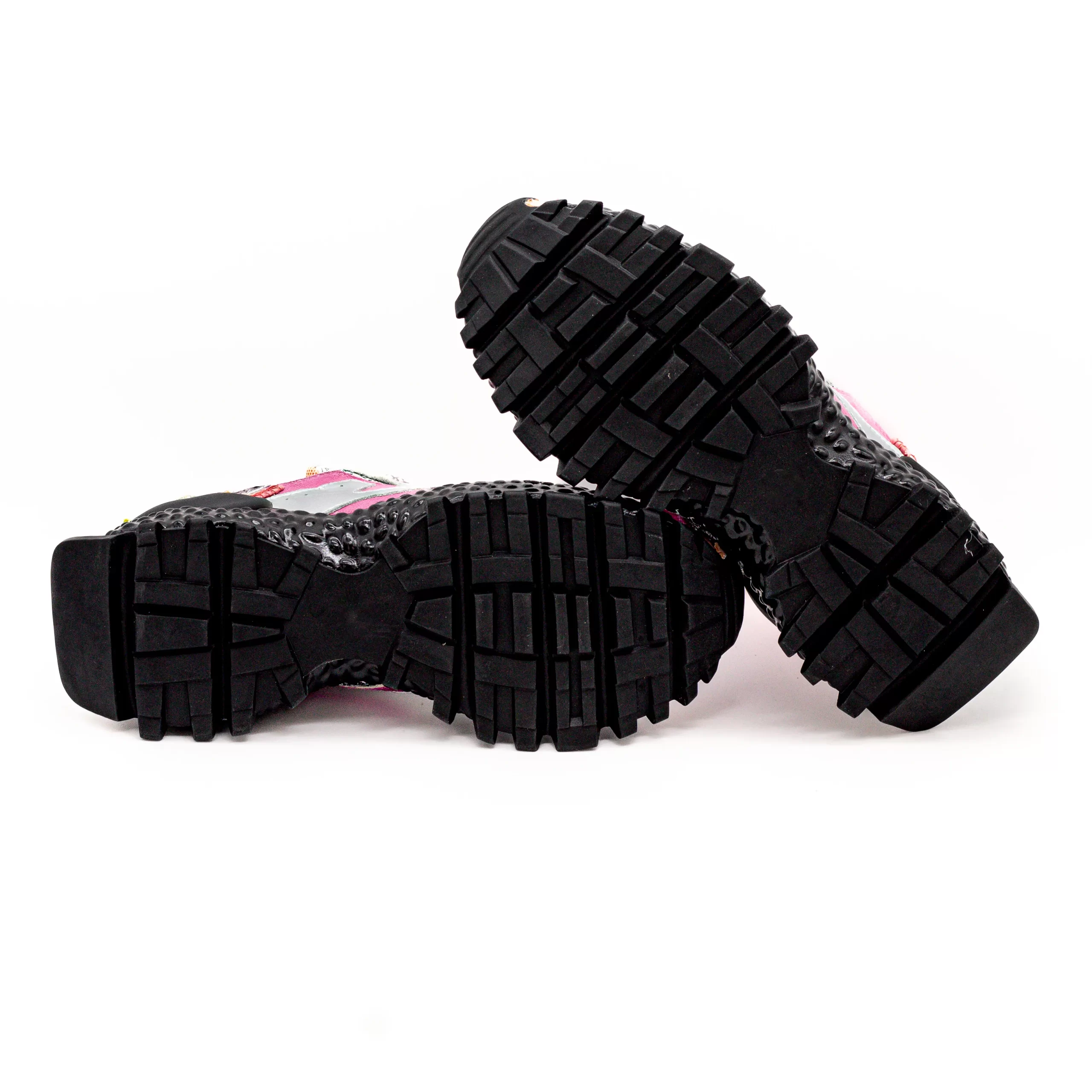Sapatilha de tons fortes, revestida a brilhantes e com texturas em grande parte do exterior.