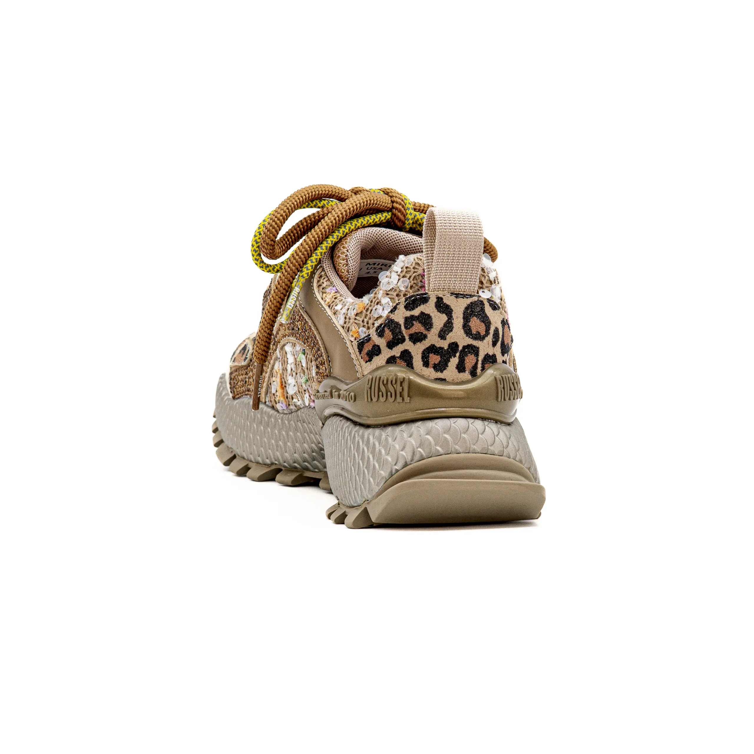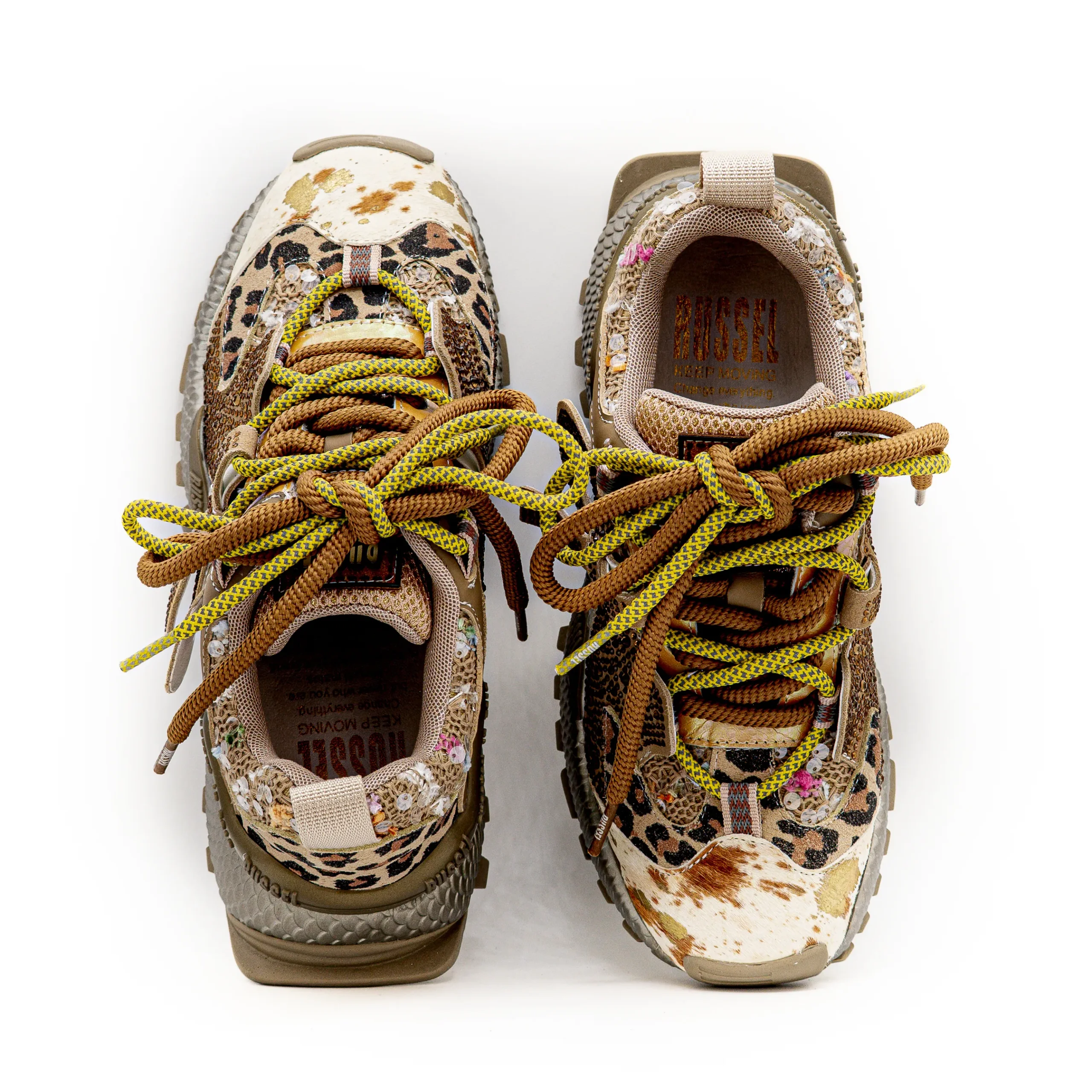 Sapatilha de tons leopardo, revestida a brilhantes e com texturas em grande parte do exterior.