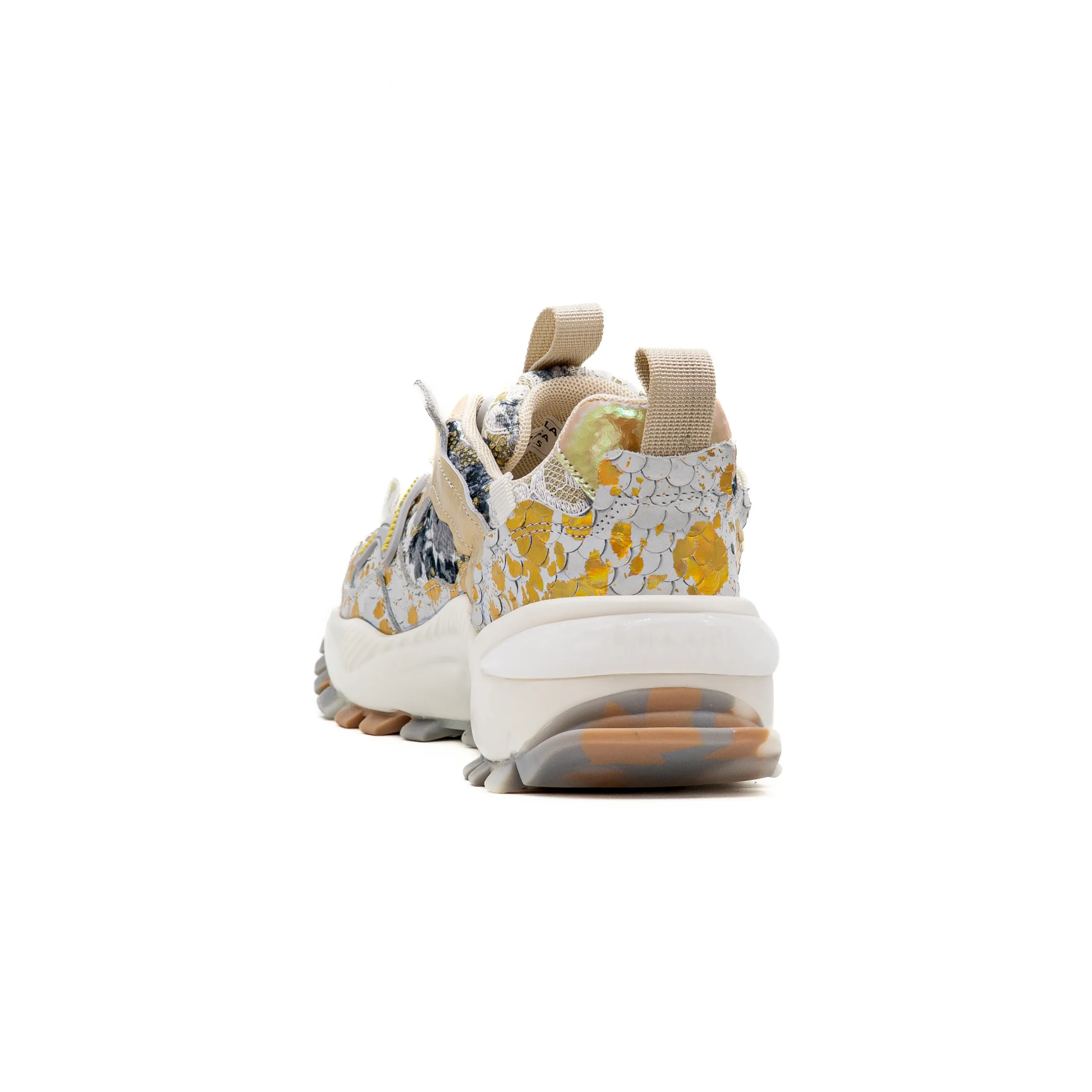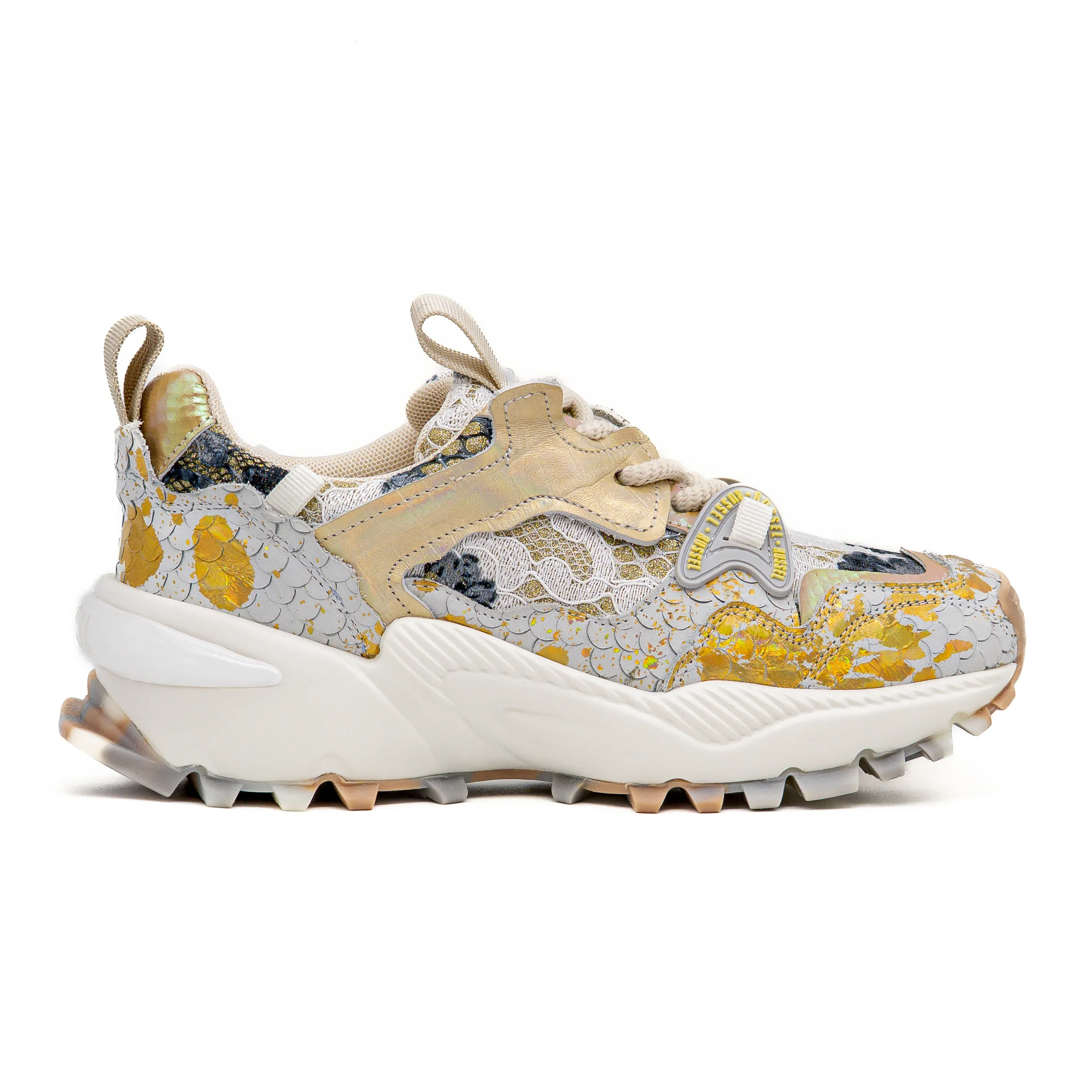 As sapatilhas Paola destacam-se pela ousadia do design, combinando texturas inovadoras, apontamentos metálicos e cores contrastantes.