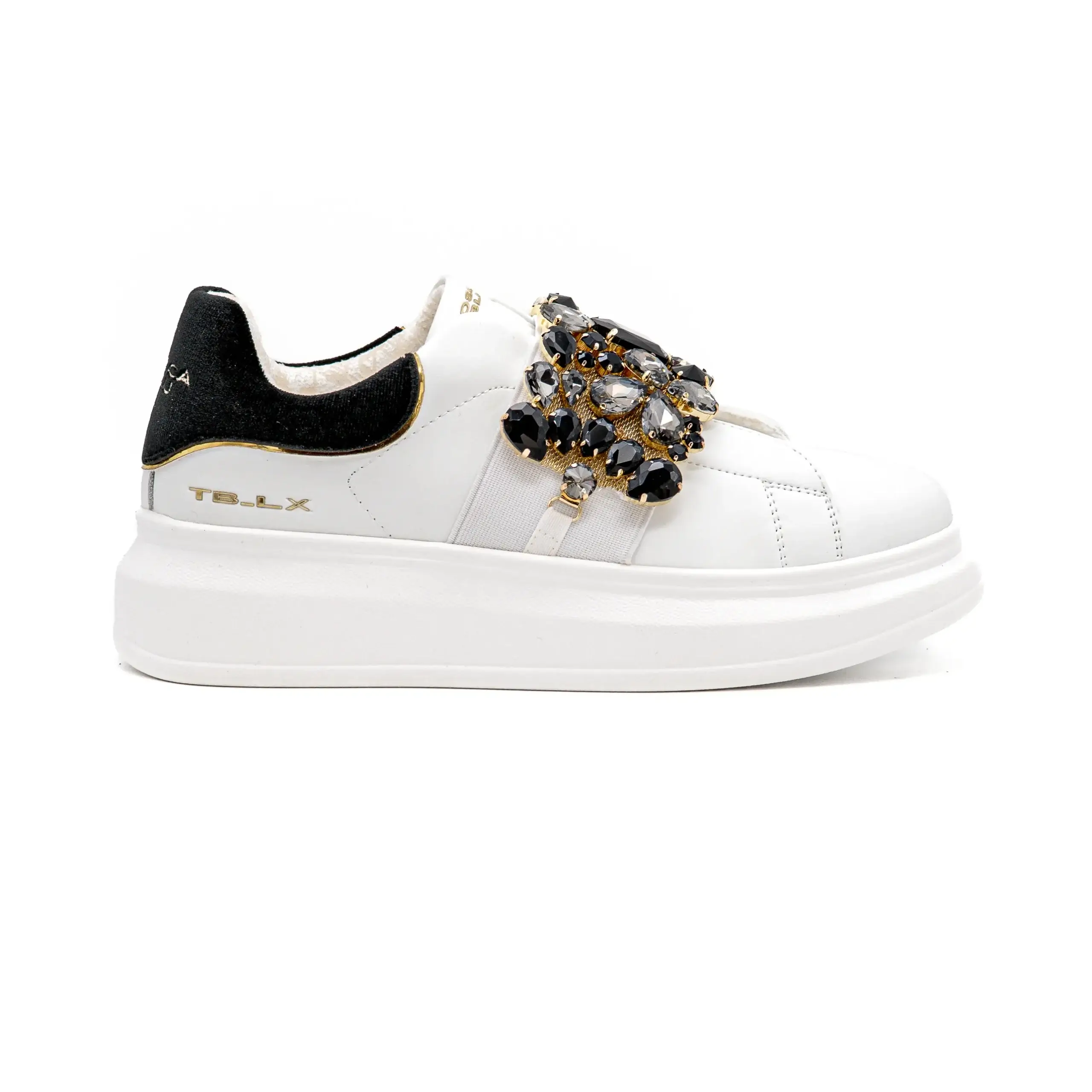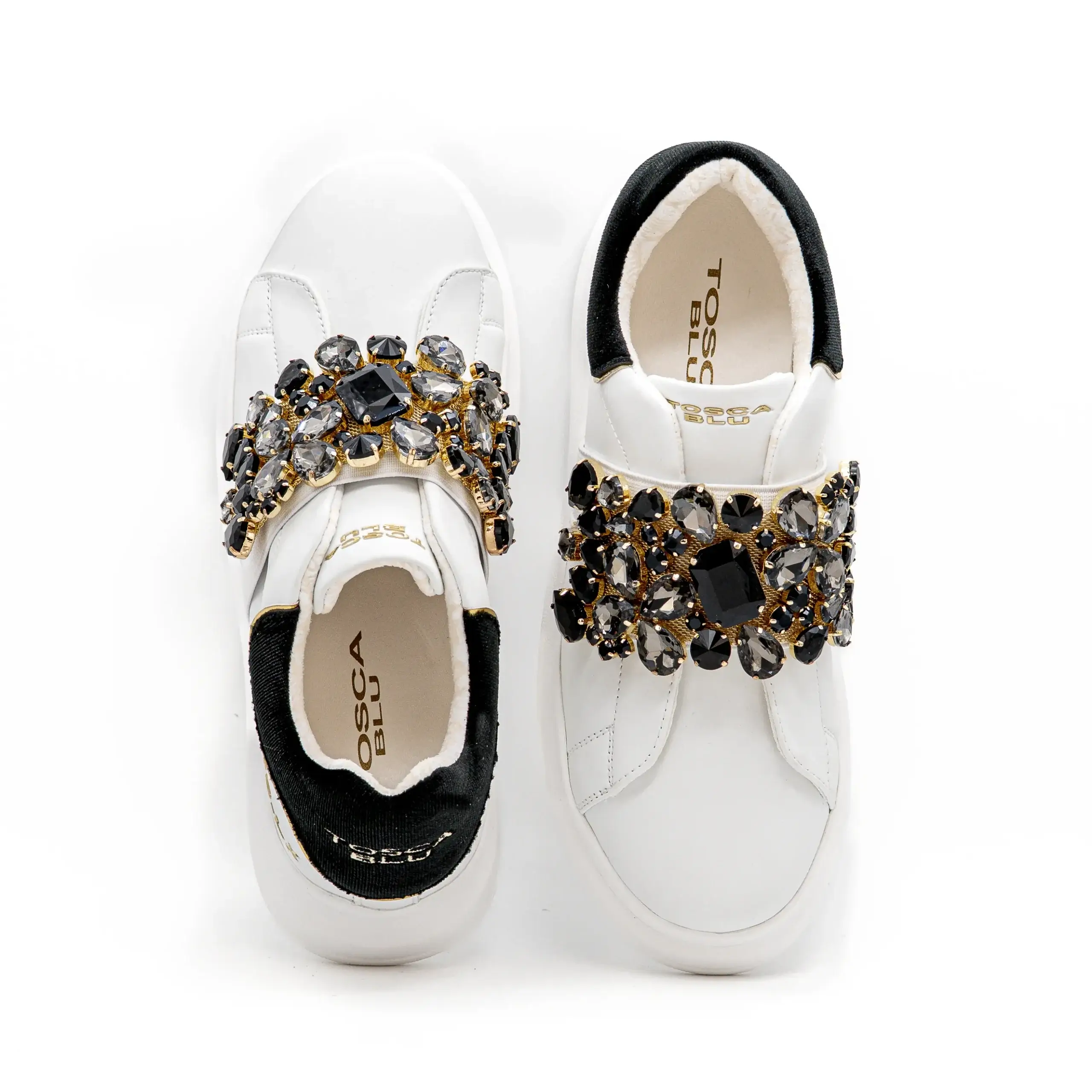 Esta sapatilha de mulher, complementada com diversas aplicações em brilho, que lhe conferem máxima elegância.