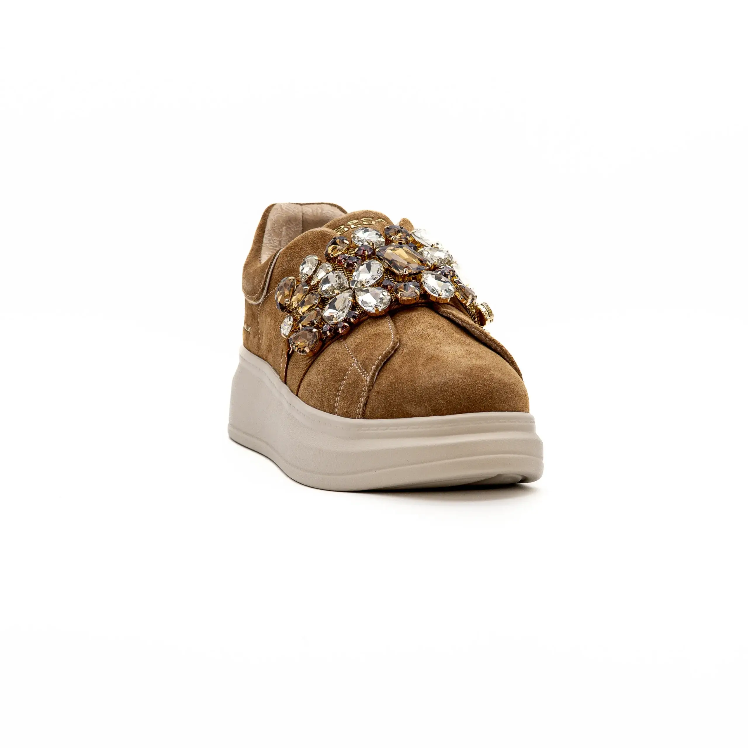 - Tira larga sob o peito do pé com aplicações;