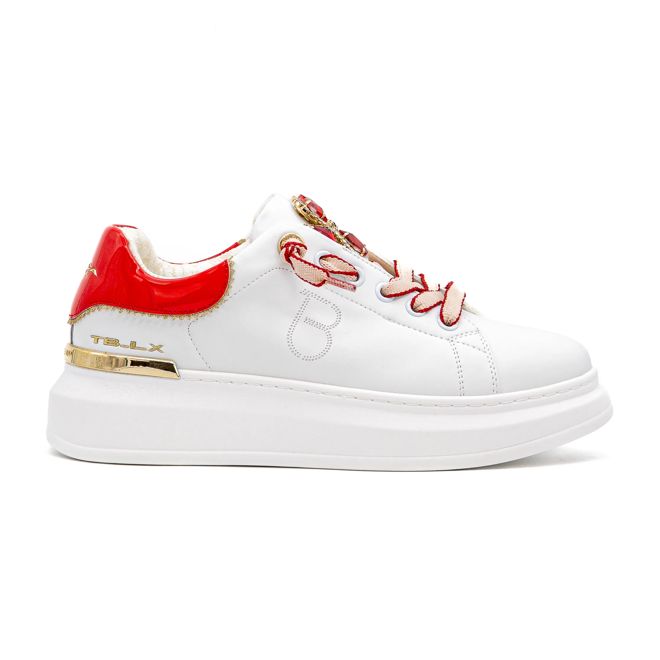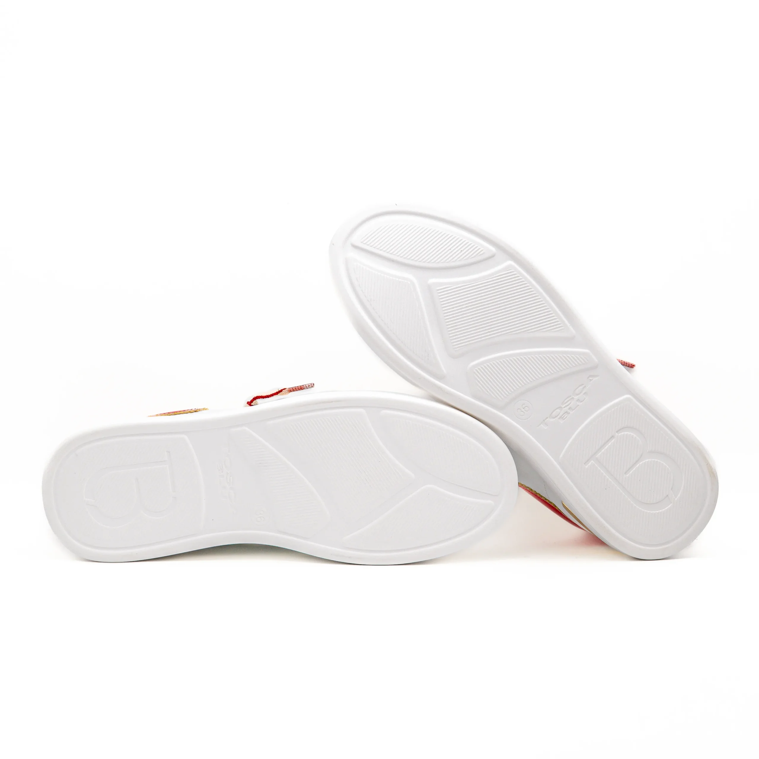 O detalhe em contraste na parte do calcanhar, em vermelho, destaca-se sobre a base branca e cria uma ligação harmoniosa com os atacadores e as aplicações no mesmo tom, conferindo um toque moderno e sofisticado.