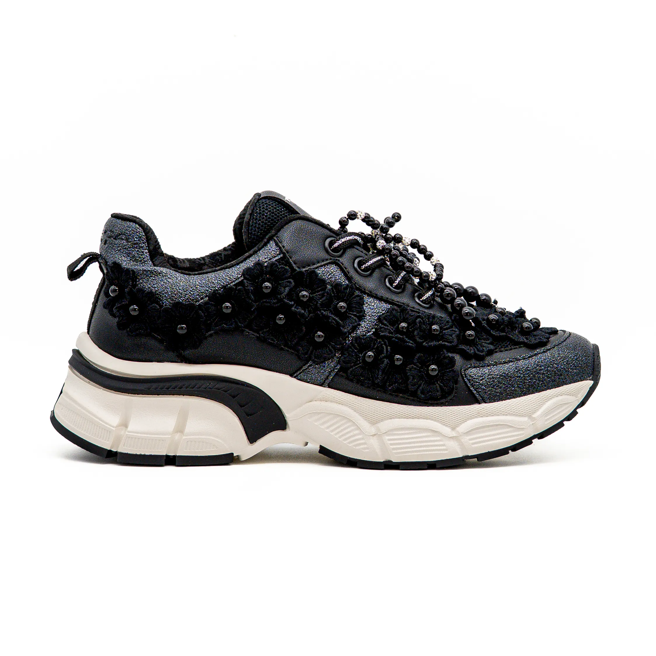 Esta sapatilha de mulher, complementada com diversas aplicações, que lhe conferem máxima elegância.