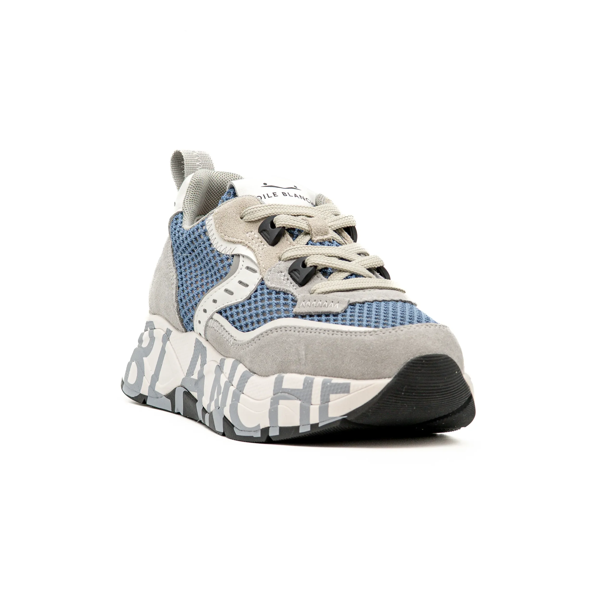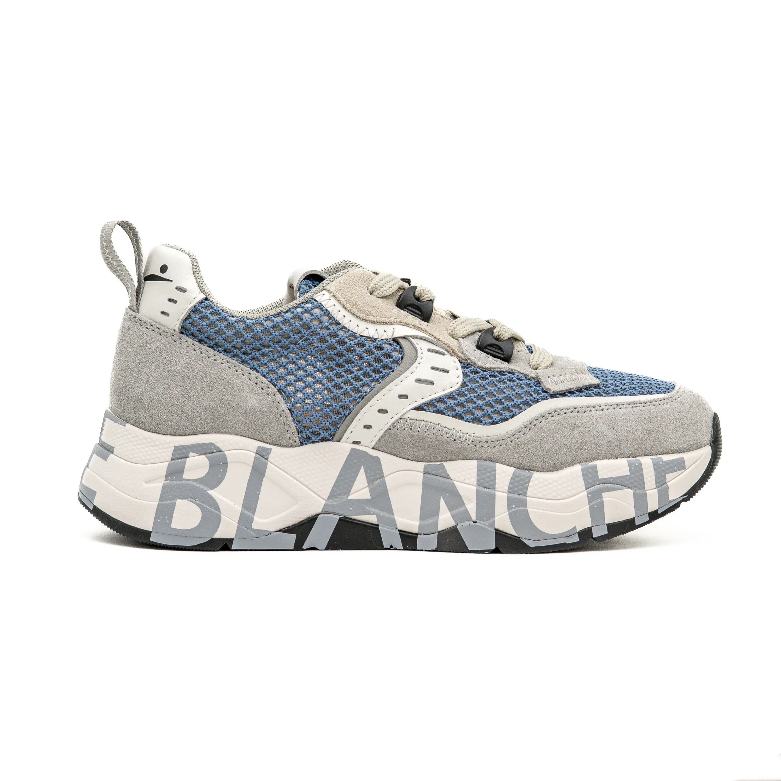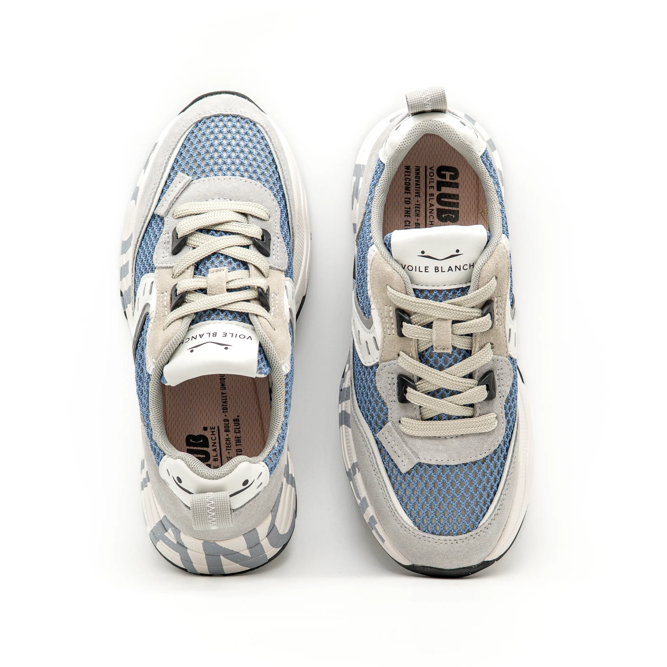 A mistura entre o azul vibrante e os tons neutros de cinza equilibra ousadia e sofisticação, tornando estas sapatilhas ideais para looks urbanos com personalidade.