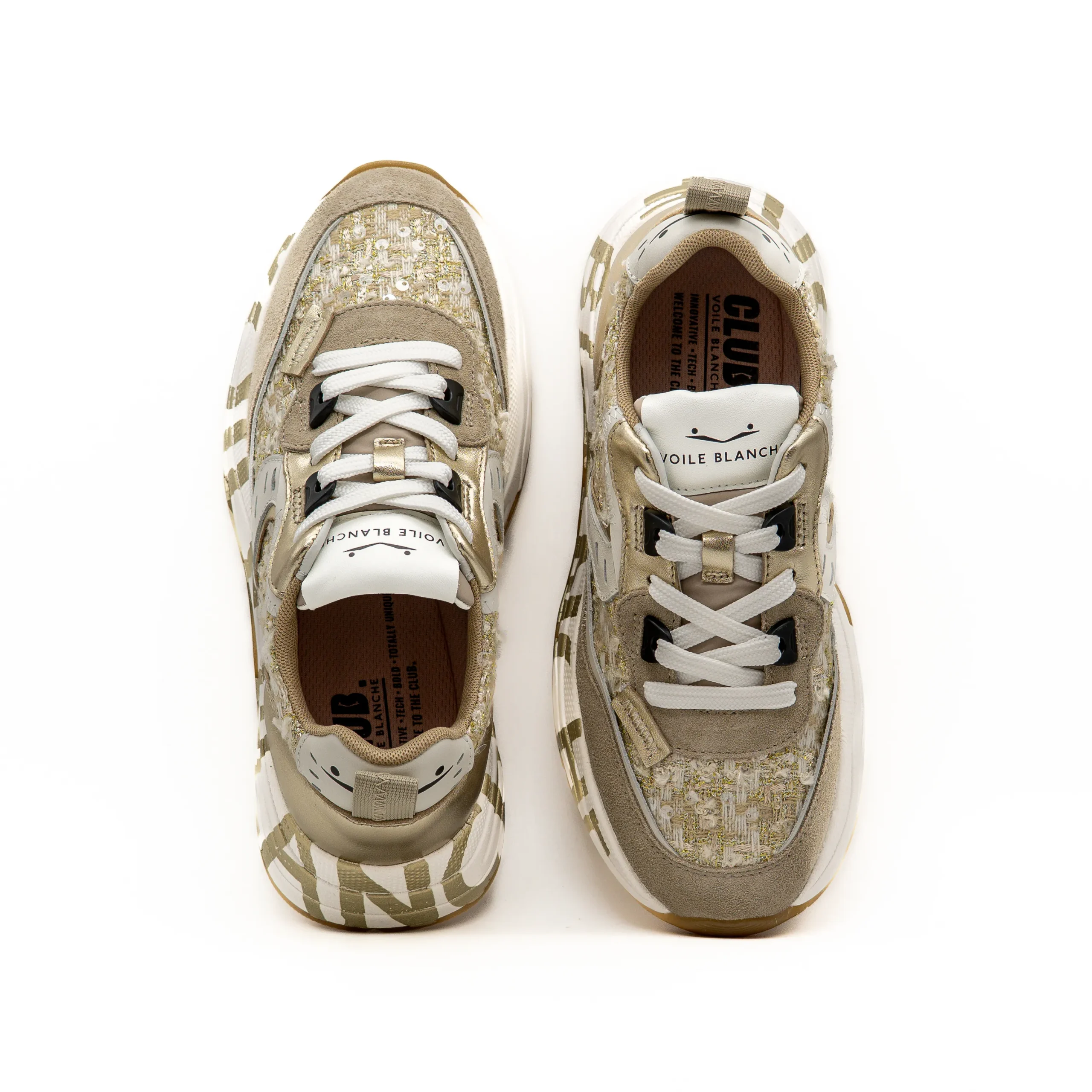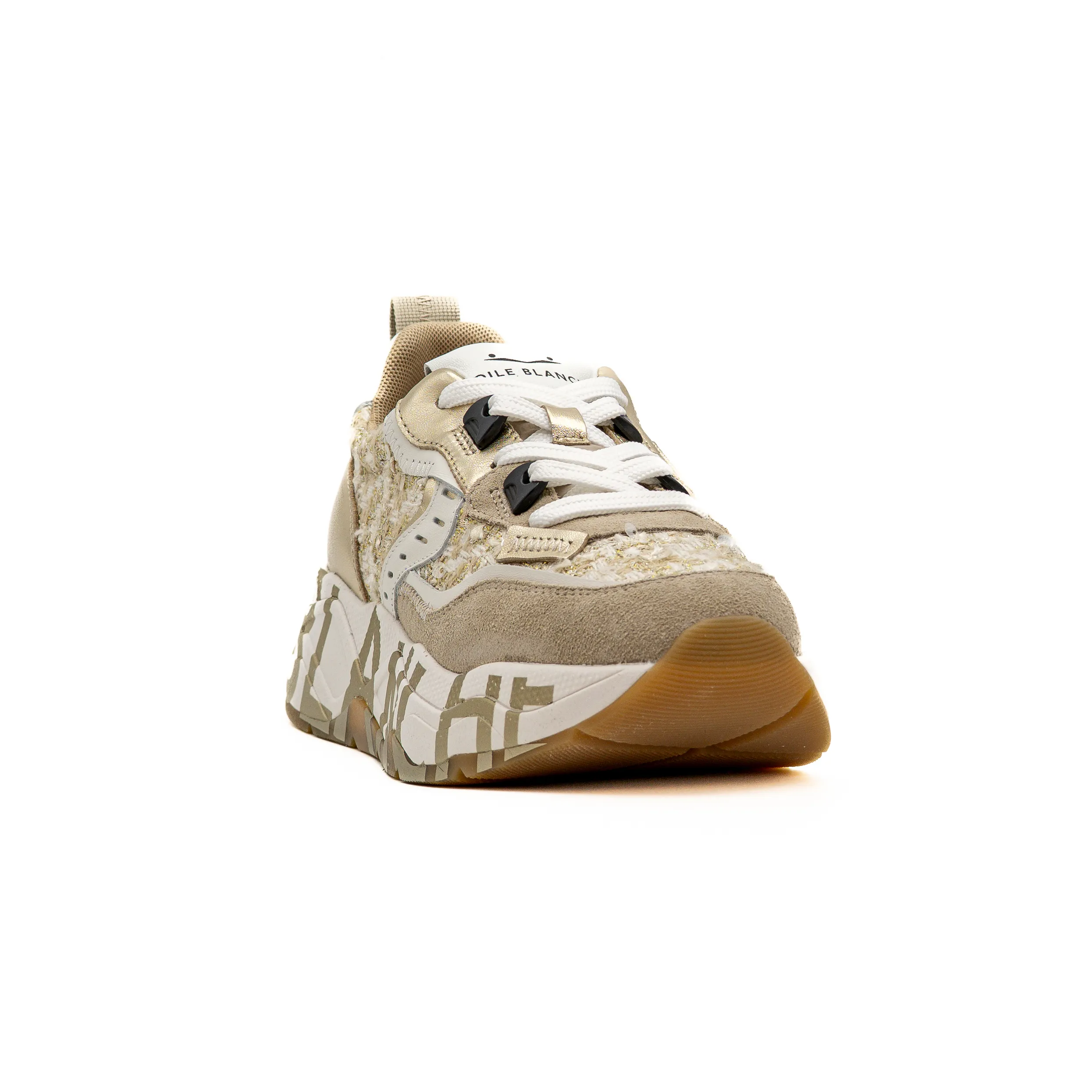 As sapatilhas Voile Blanche ganham destaque neste modelo com um tecido texturado dourado brilhante, perfeito para quem procura um toque sofisticado e luminoso no look diário.