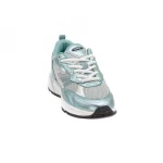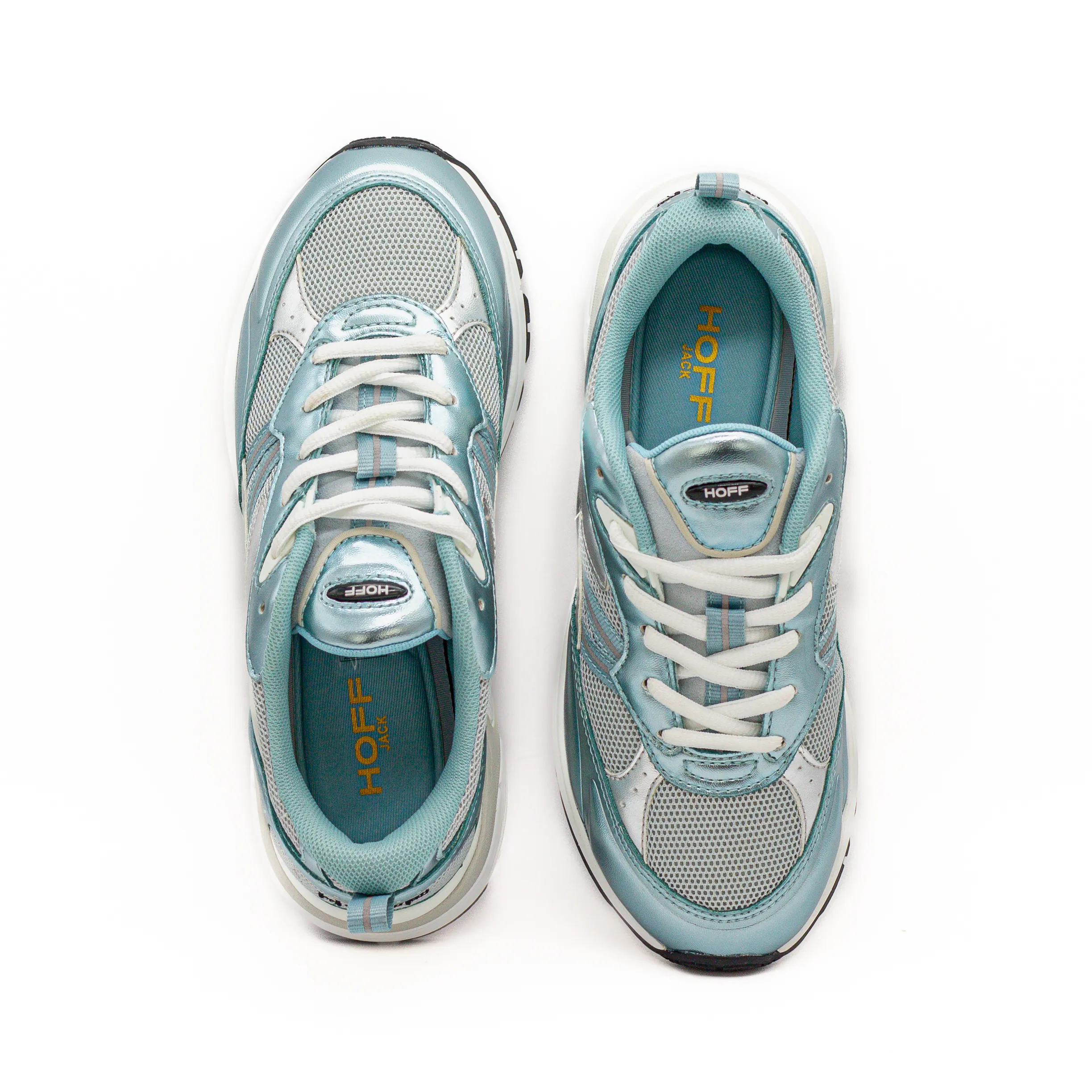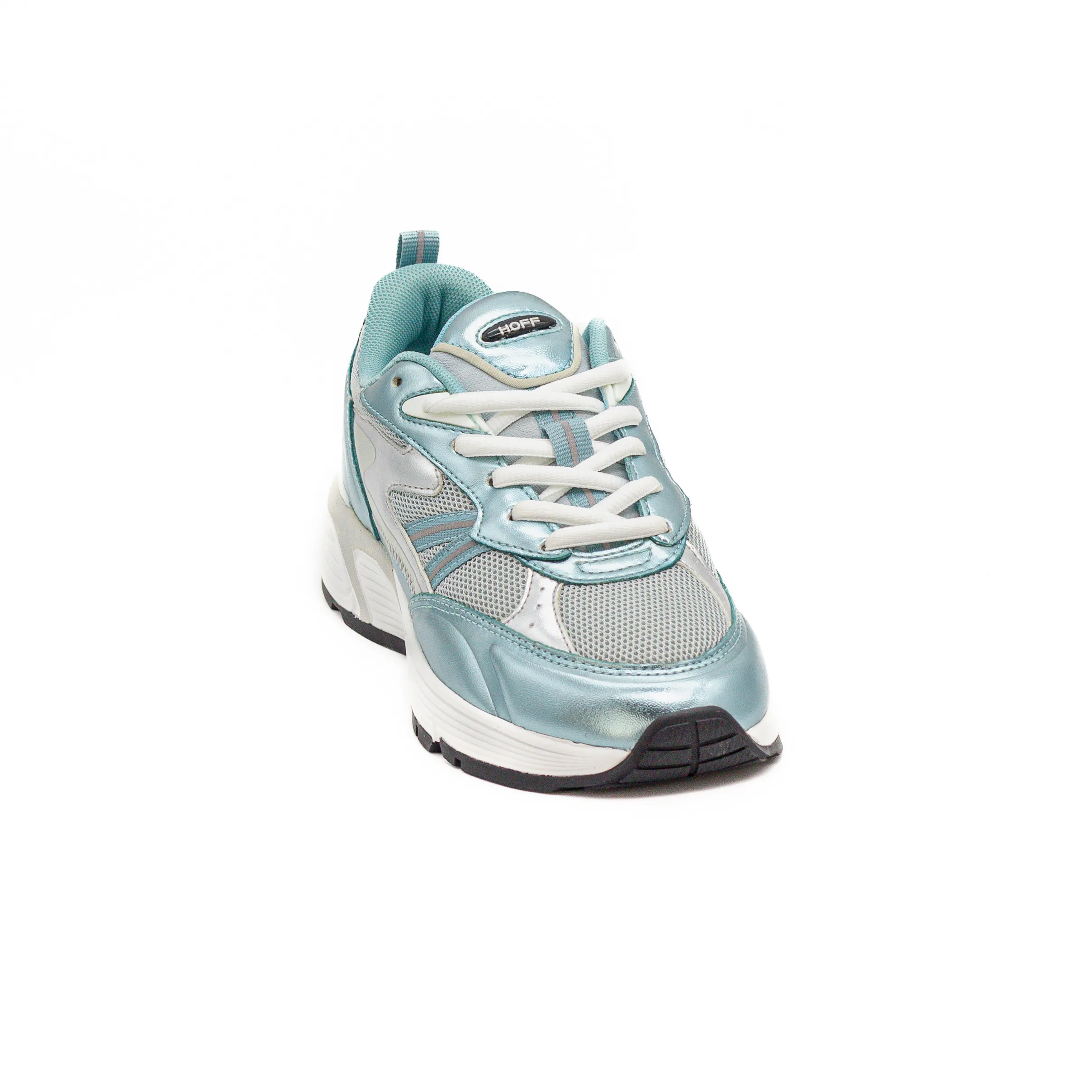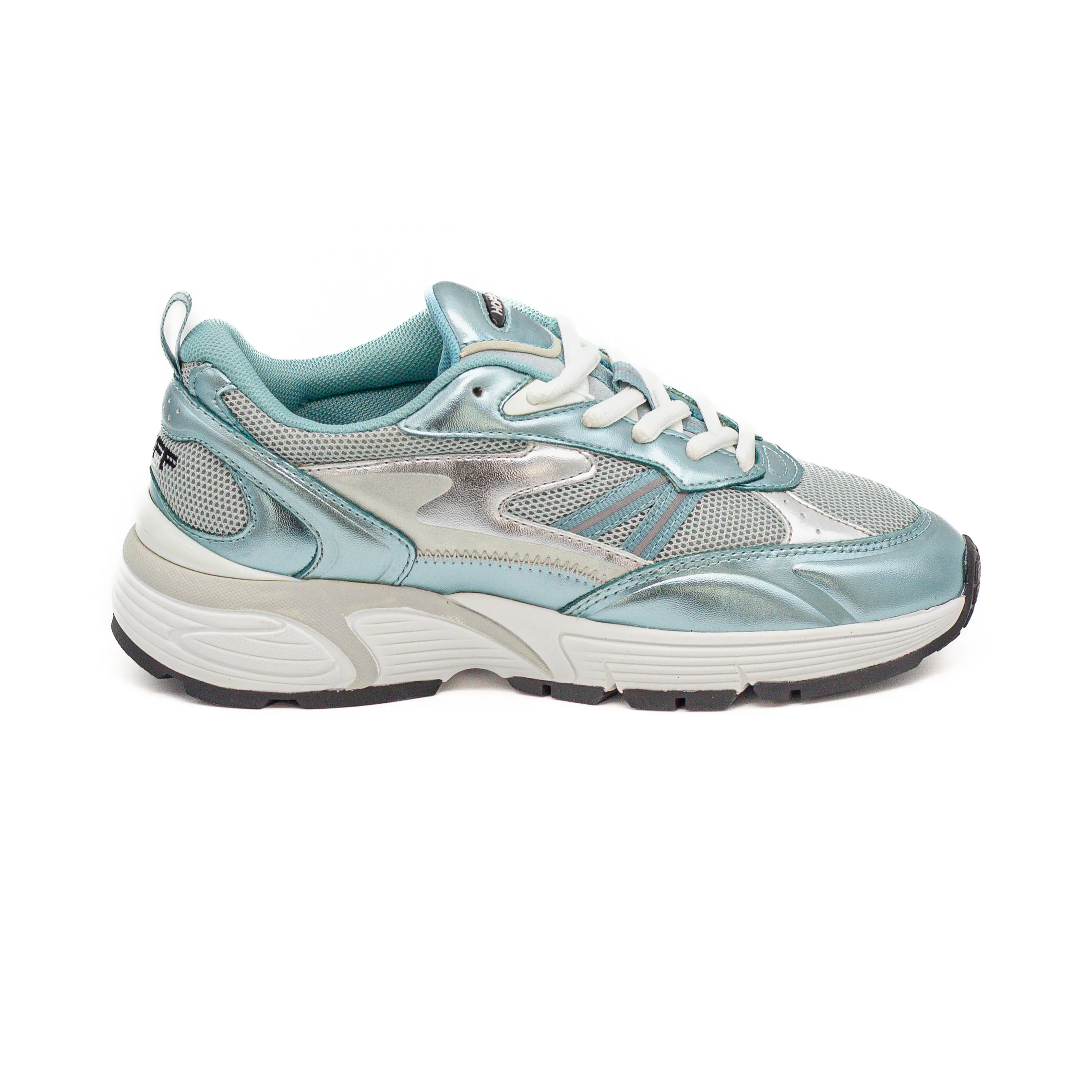 Um sapatilha que reverte a um estilo running numa combinação de materiais com acabamentos metálicos.